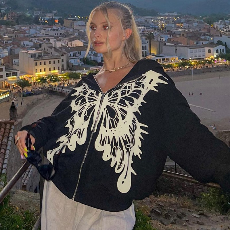 Lizakosht Butterfly Print Hooded Long Sleeve Graphic Sweatshirt Autumn Winter Oversized Streetwear Casual Grunge Clothes Y2K