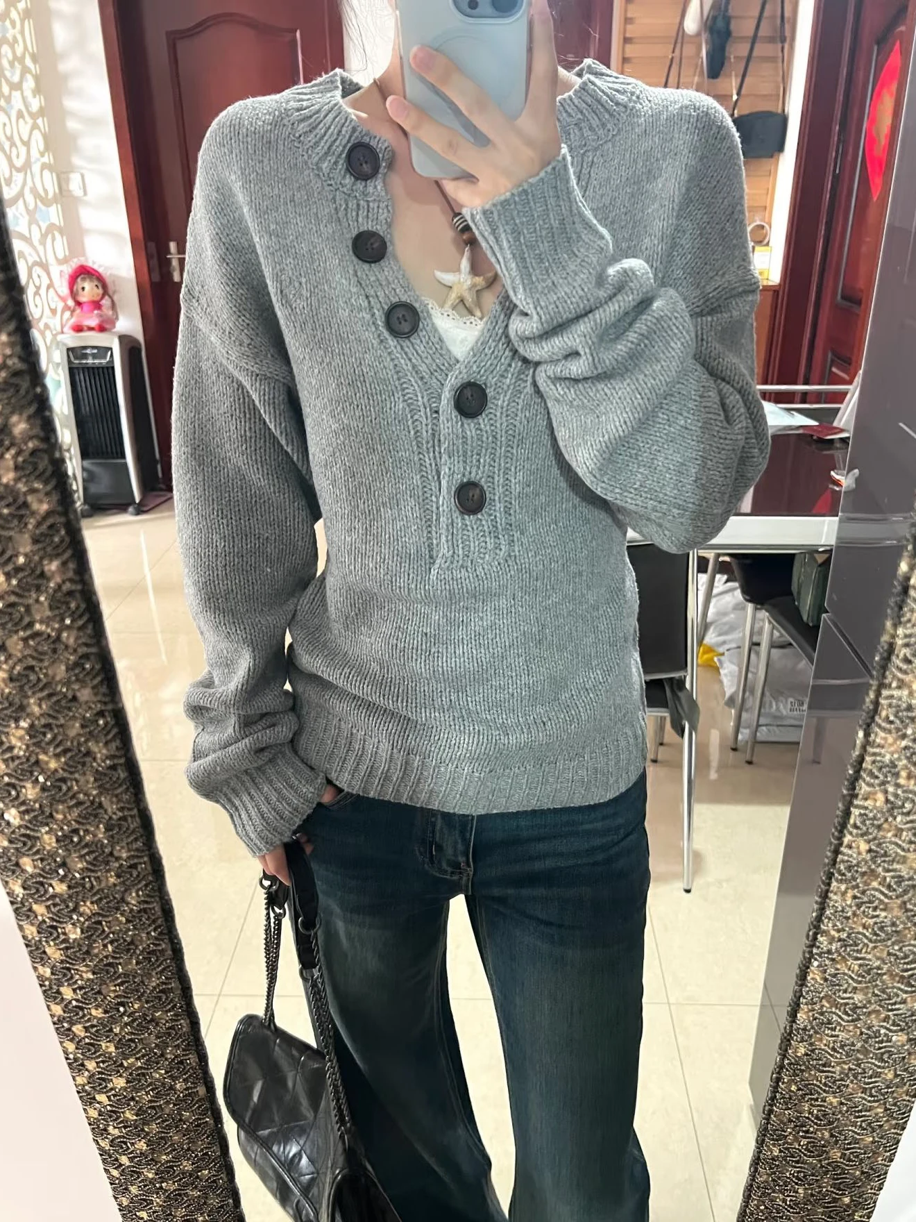 LIZAKOSHT  -  Buttons Grey Sweaters Woman Spring O-neck Long Sleeve Knitted Pullover Top Female Casual Vintage Preppy Style Jumpers Harajuku