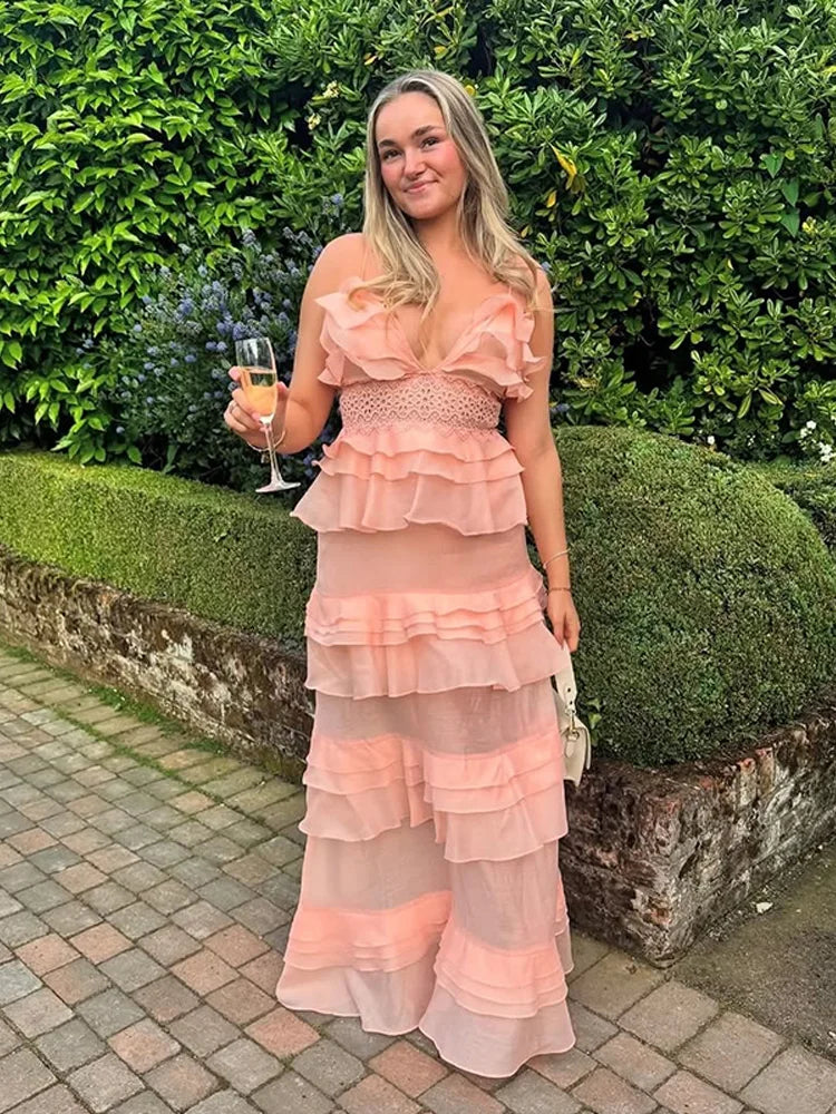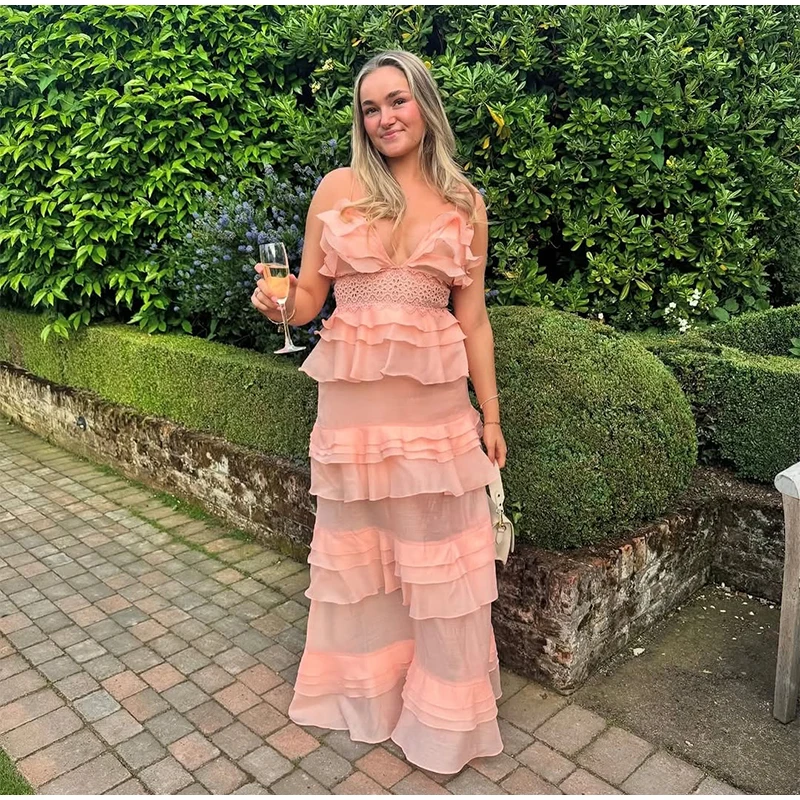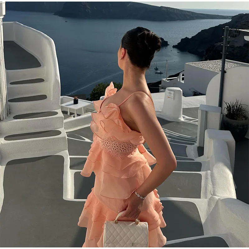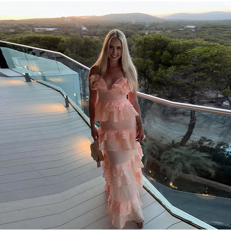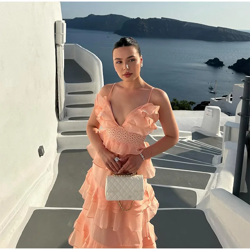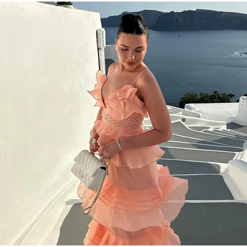 LIZAKOSHT - Cascading Ruffle Slip Women's Dress V-neck Sleeveless Hollow Out Waist Cinching Evening Party Dresses 2025 Summer Elegant Robe