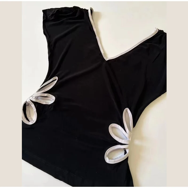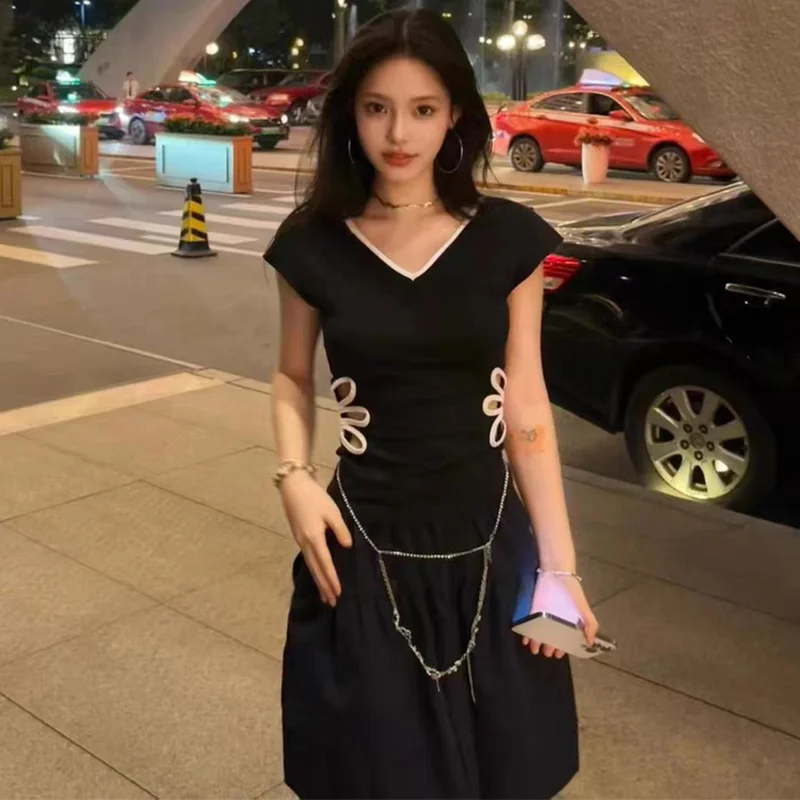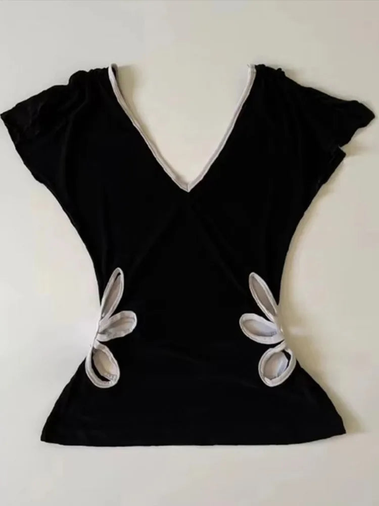 LIZAKOSHT  -  Casual Embroidery T-Shirt Women V Neck Slim Waist Hollow Out Short Sleeves Top Female 2025 Spring Fashion Patchwork Top Lady