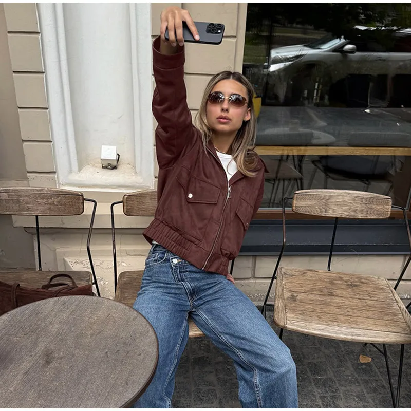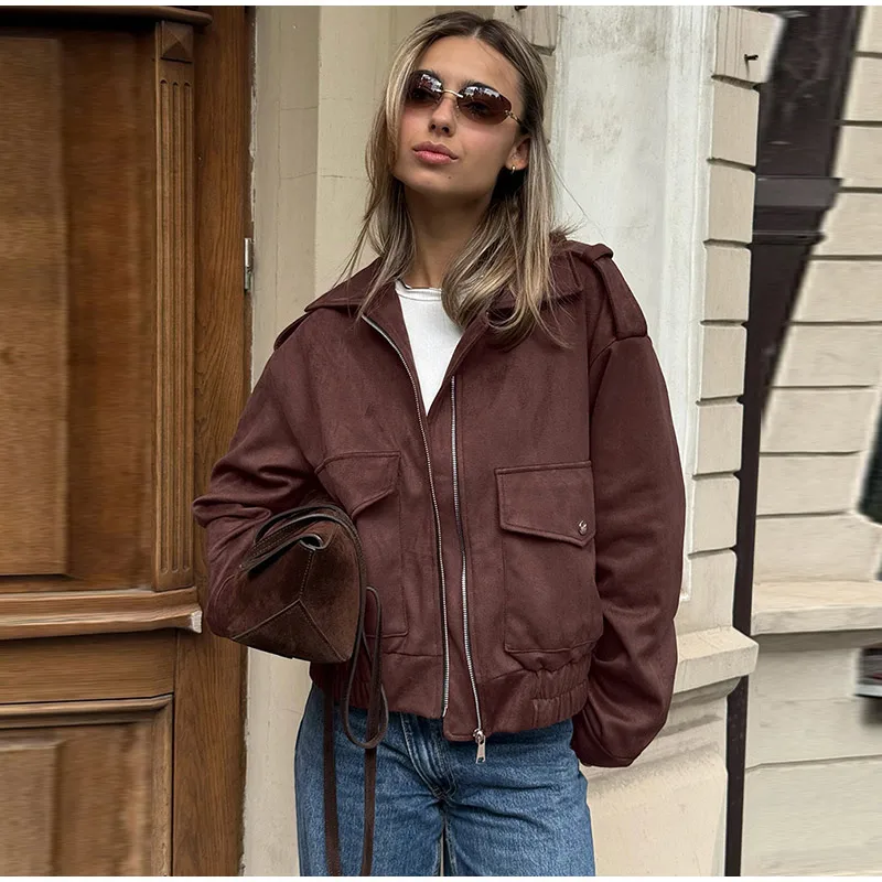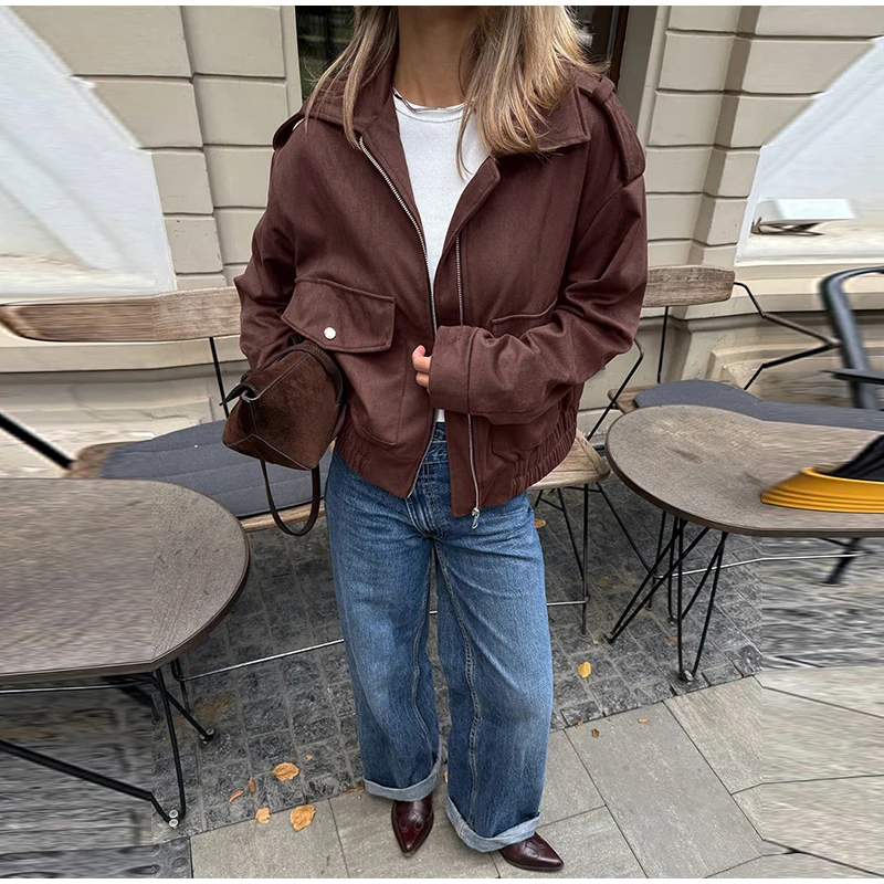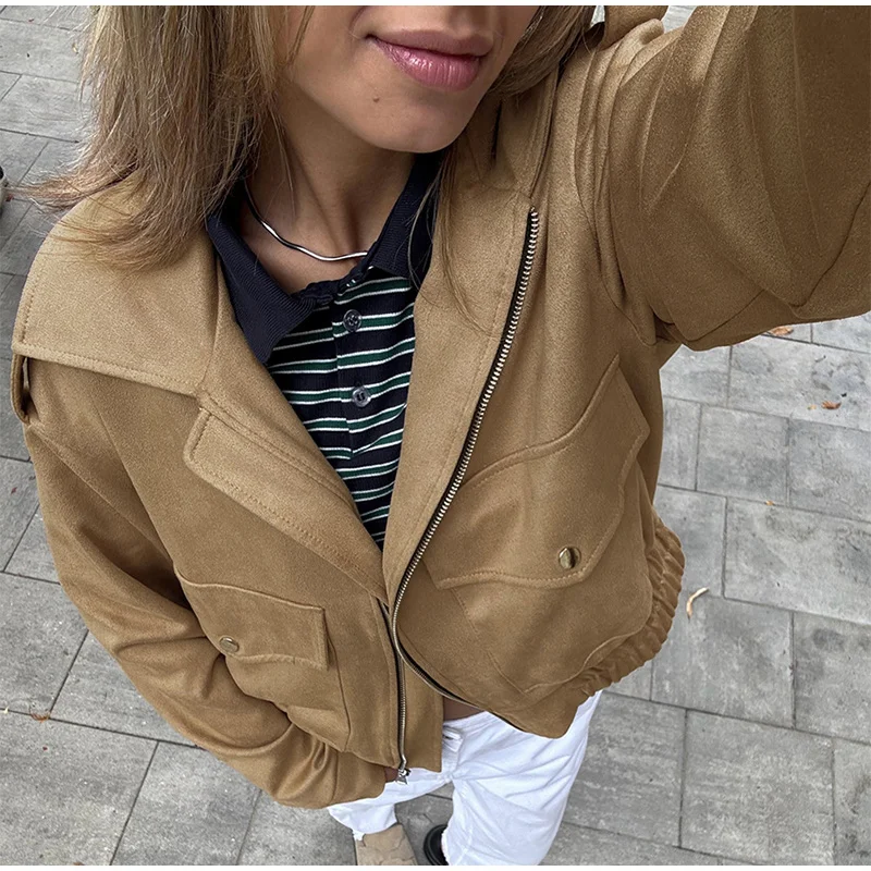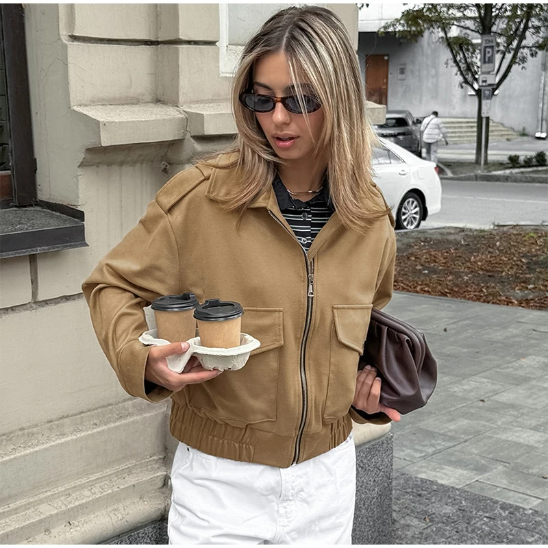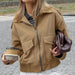 LIZAKOSHT - Casual Flip Collar Zipper Pocket Jacket Woman Solid Color Long Sleeves Loose Street Coats Chic Women's Warm Early Autumn Jackets