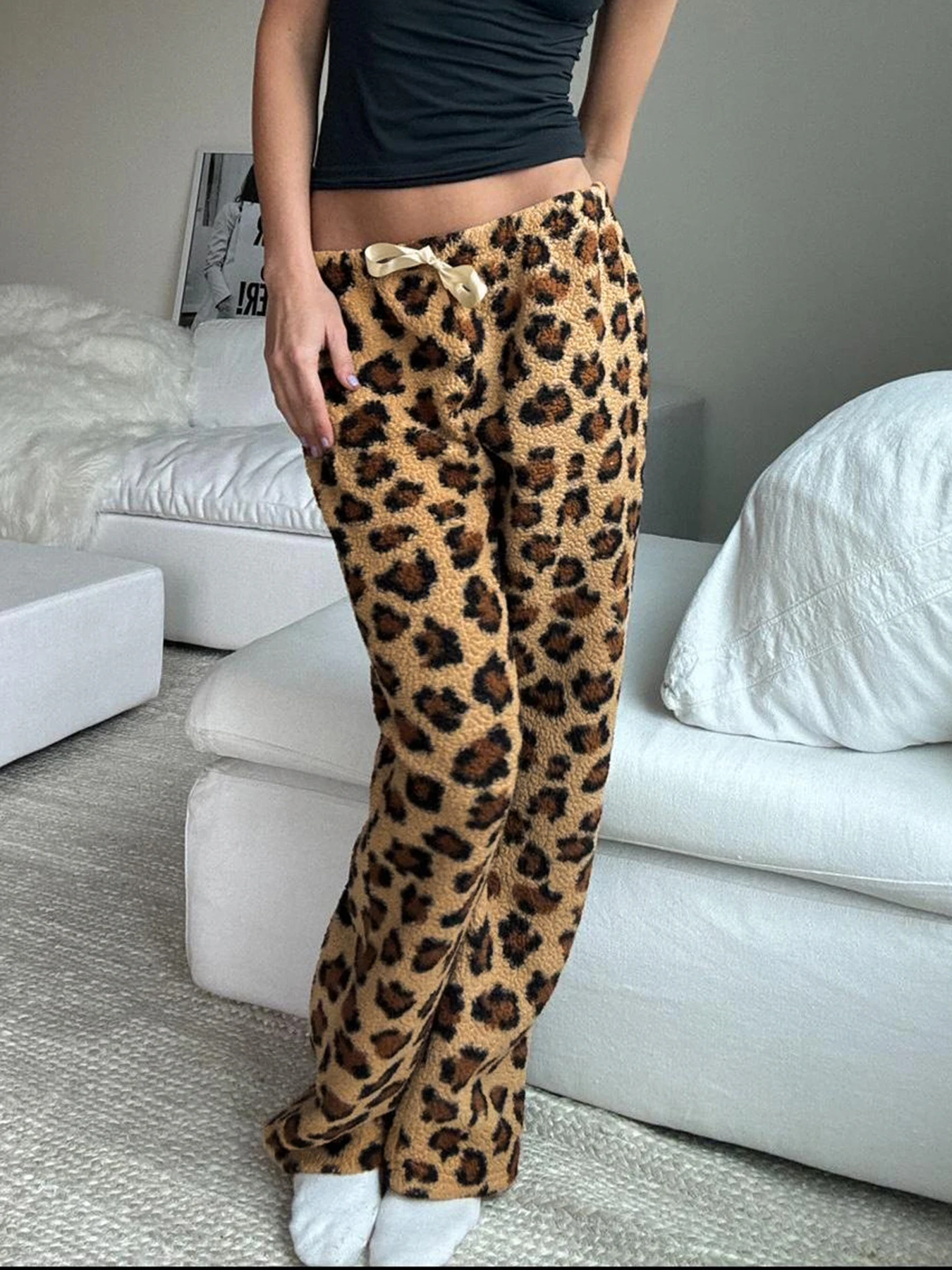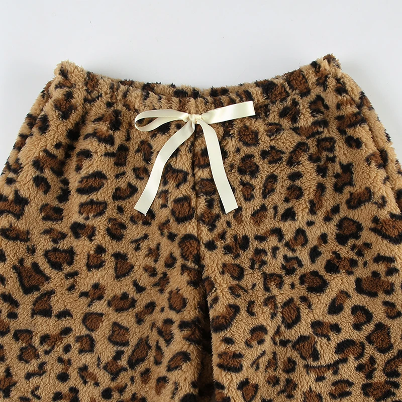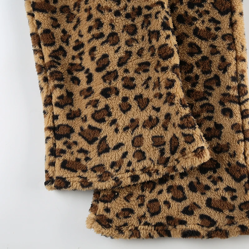 LIZAKOSHT - Casual Leopard Printed Wide Leg Pants Loose Furry Mid-Waisted Straight Pants Women Autumn Winter Fashion Streetwear