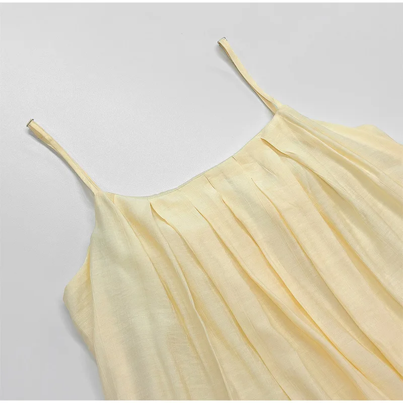 LIZAKOSHT - Casual Loose Pleated Sling Long Dress Women Chic Simple Beige Sleeveless Low Cut Holiday Dresses Lady Retro Summer Beach Vestido