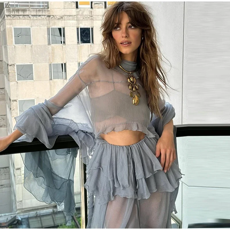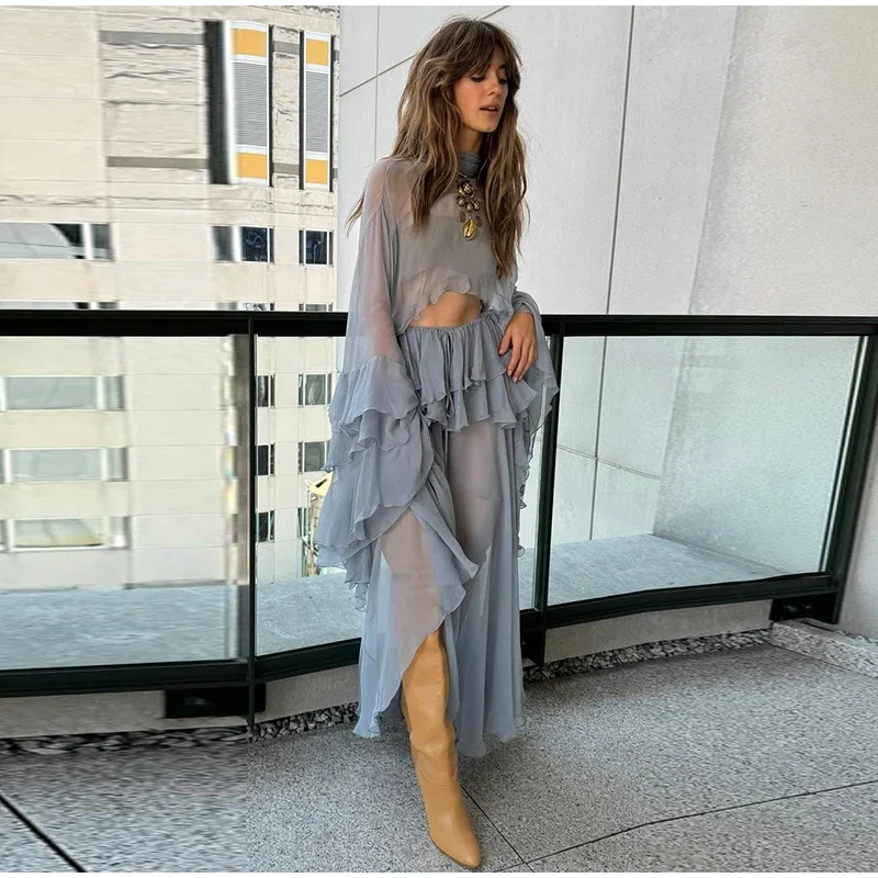 LIZAKOSHT - Casual Ruffle Turtleneck Shirt Skirt Women Set Solid Full Sleeve Hallow Out Top See Through Pleated Long Skirts 2025 Lady Suit