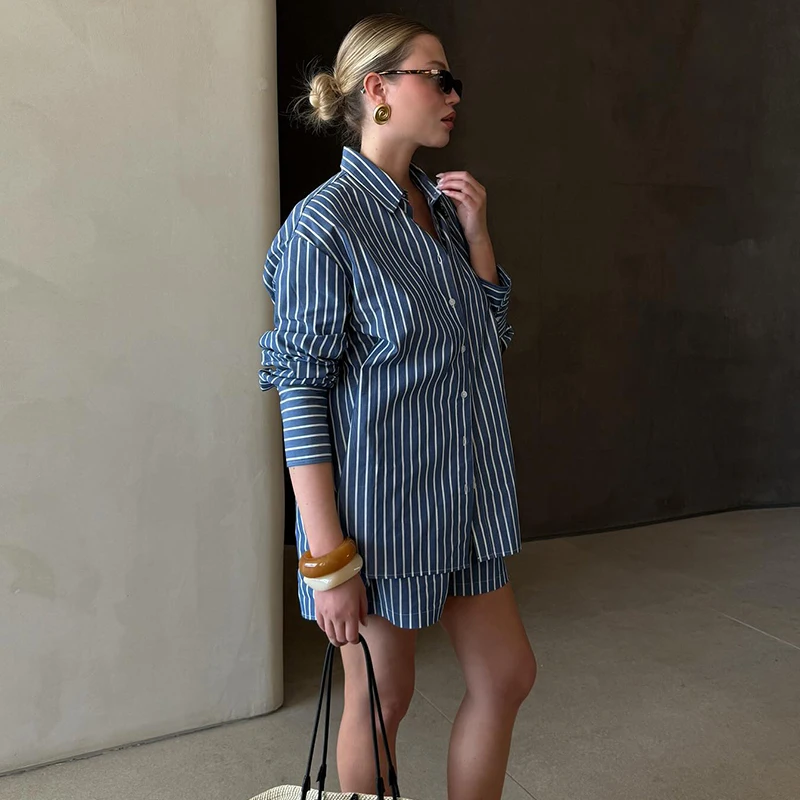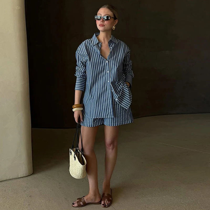 LIZAKOSHT  -  Casual Striped Shorts Suits Women Loose Lapel Long Sleeves Single Breasted Shirts Set Female 2025 Summer Fashion Chic Sets Lady