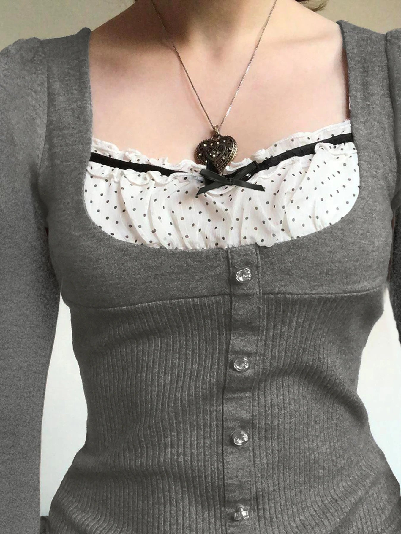 LIZAKOSHT - Casual Sweet Patchwork Dot Bow T Shirt Slim Square Collar Long Sleeve Tees Women Autumn Spring Fashion Streetwear