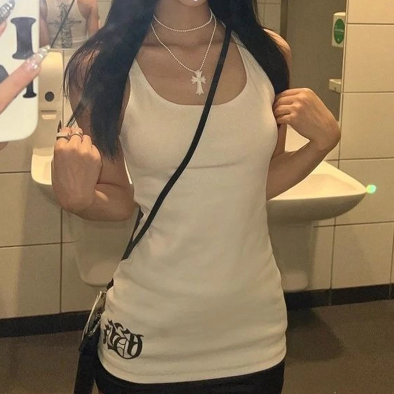 LIZAKOSHT - Casual Tank Top Women Chic Printing Sleeveless O Neck Slim Tank Top New Simple Design Sense Spice Girl Y2k Tops