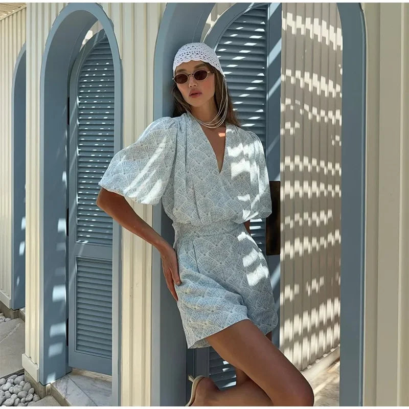 LIZAKOSHT - Casual Women Flower Printed Shirts Shorts Suit Elegant Short Sleeve V-Neck Top Straight Short Pants 2025 Summer Beach Lady Suit