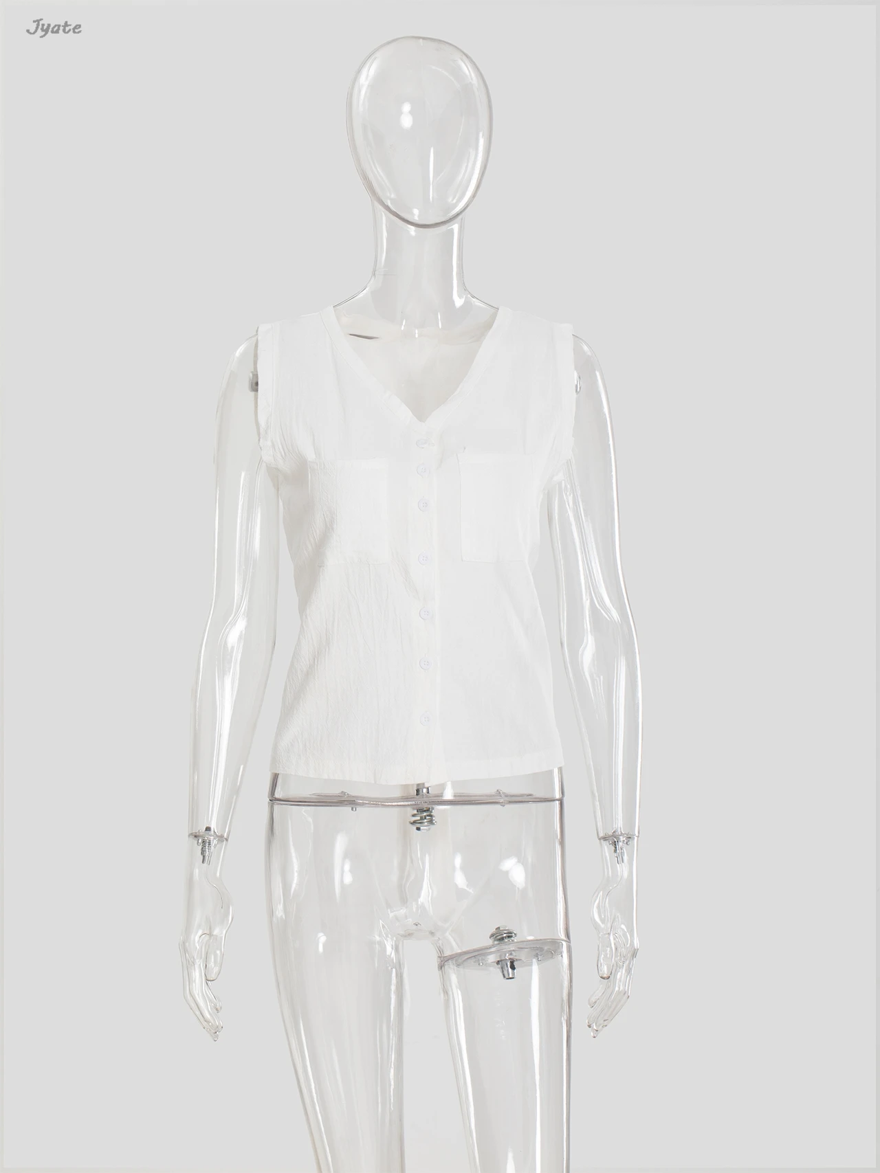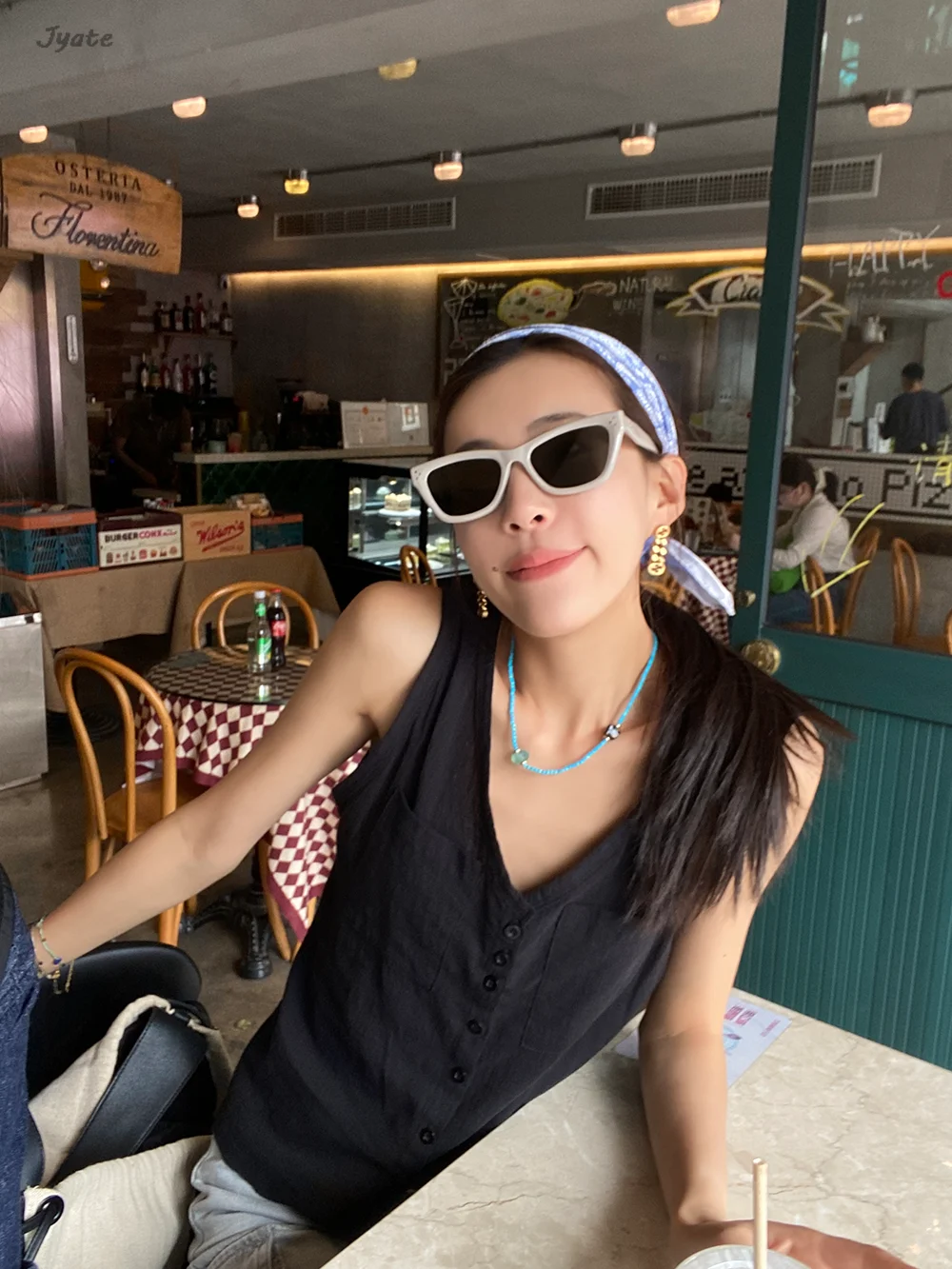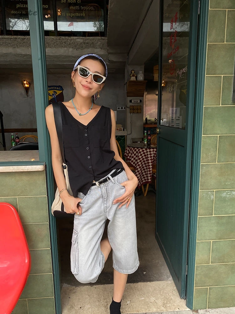 LIZAKOSHT - Casual Women Thin Cotton Summer Vest New V-neck Pocket Single Breasted Office Lady Tank Beige Black Fashion Sleeveless Top