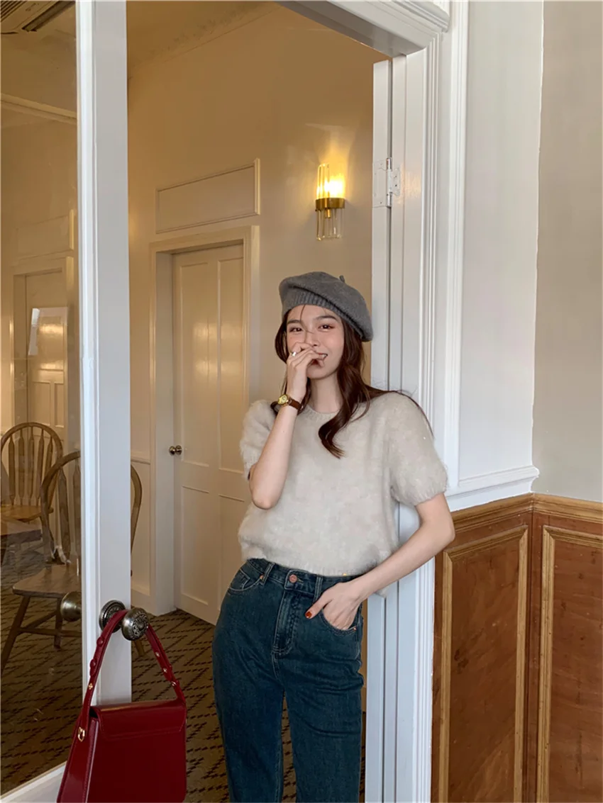 LIZAKOSHT - Chic Women Jumpers Knitted Solid Warm Spring Loose Sweet Short Sleeve Sweaters Pullovers Bottoming Fashion Slim