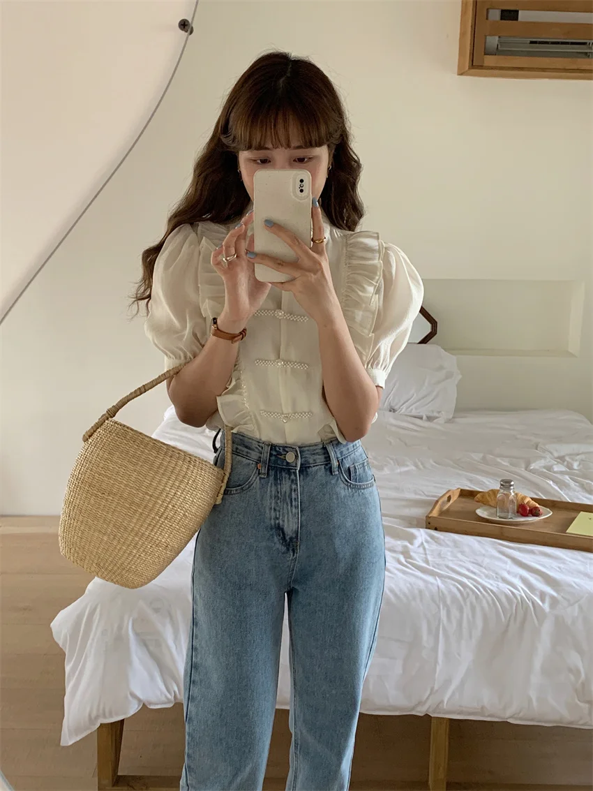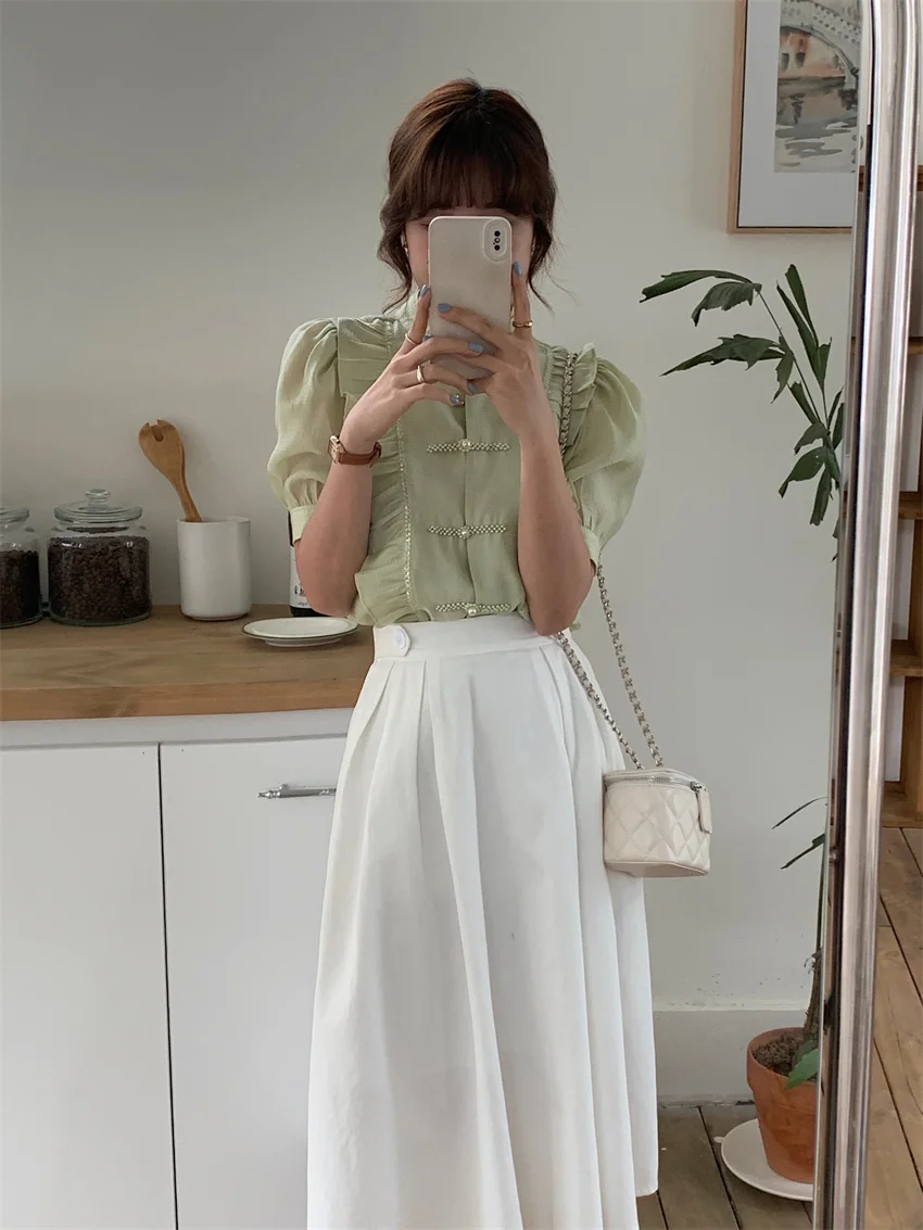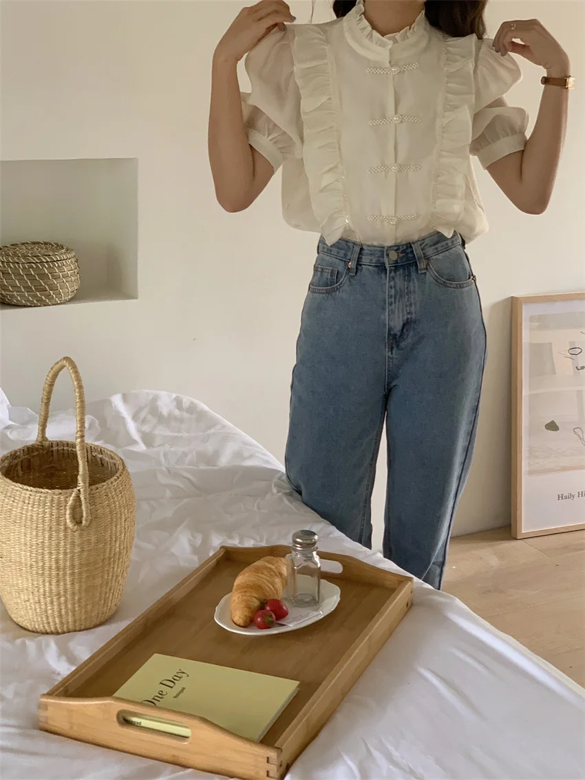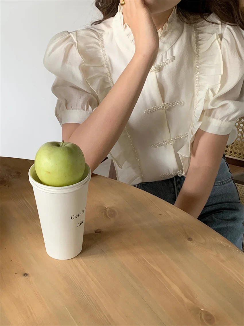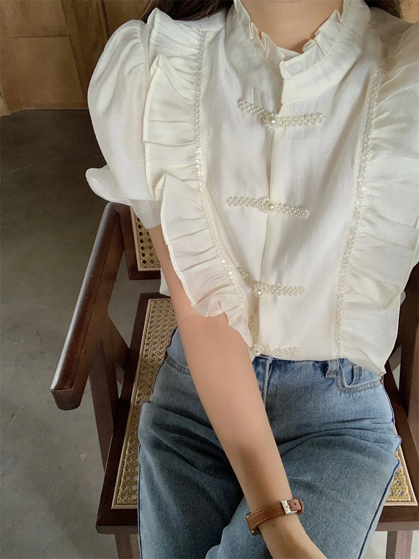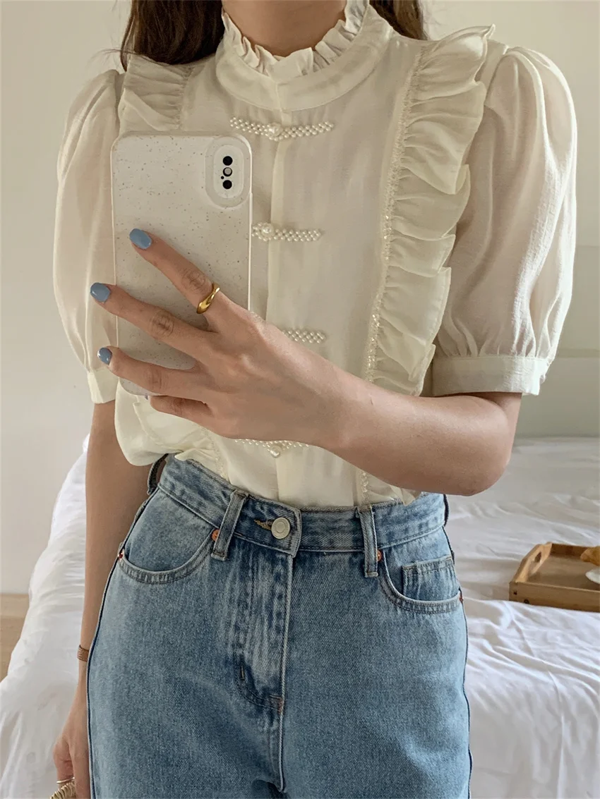 LIZAKOSHT - Chinese Style Shirts Women Stand Ruffles Gentle Slim New Summer Vintage Office Lady Half Sleeve Elegant