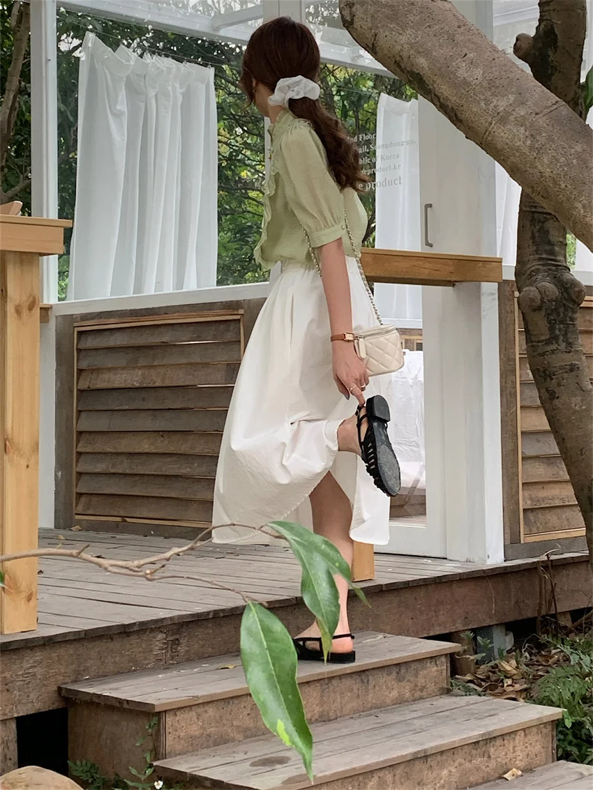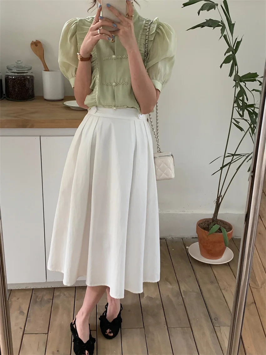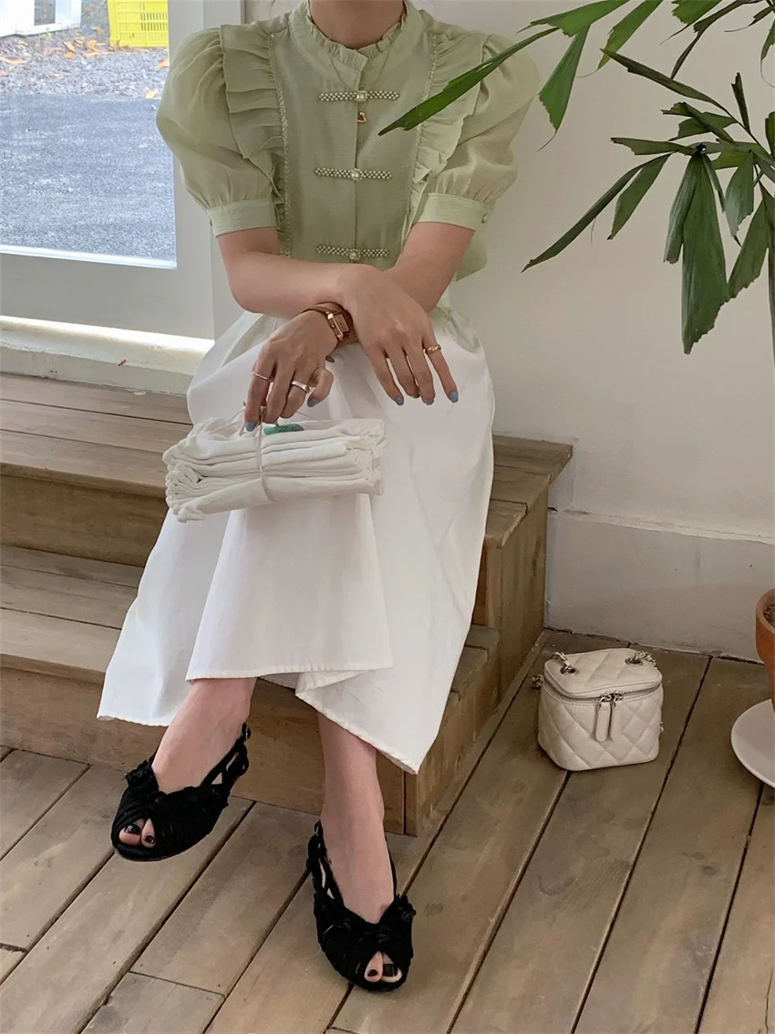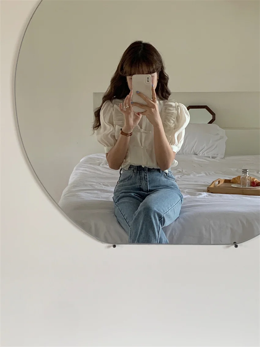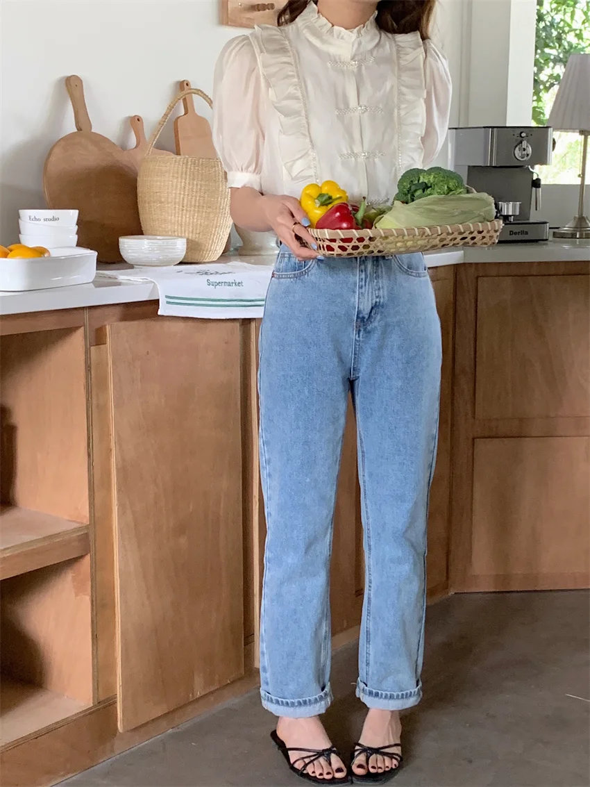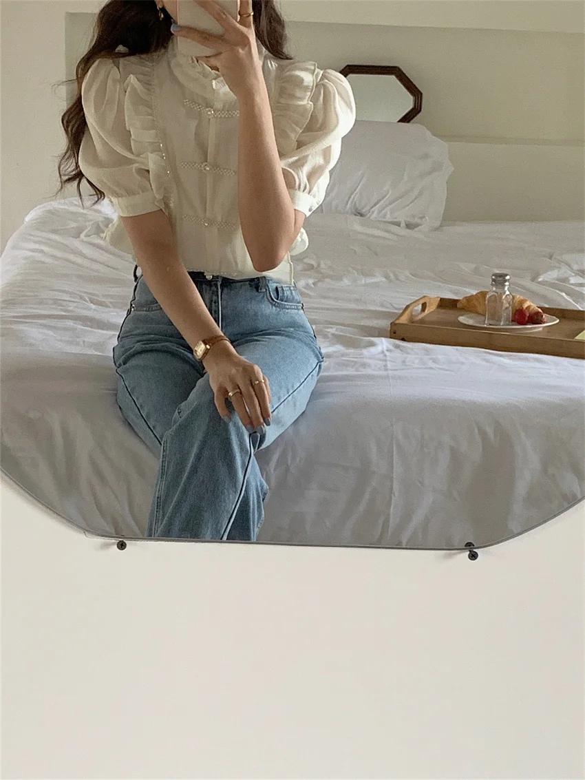 LIZAKOSHT - Chinese Style Shirts Women Stand Ruffles Gentle Slim New Summer Vintage Office Lady Half Sleeve Elegant