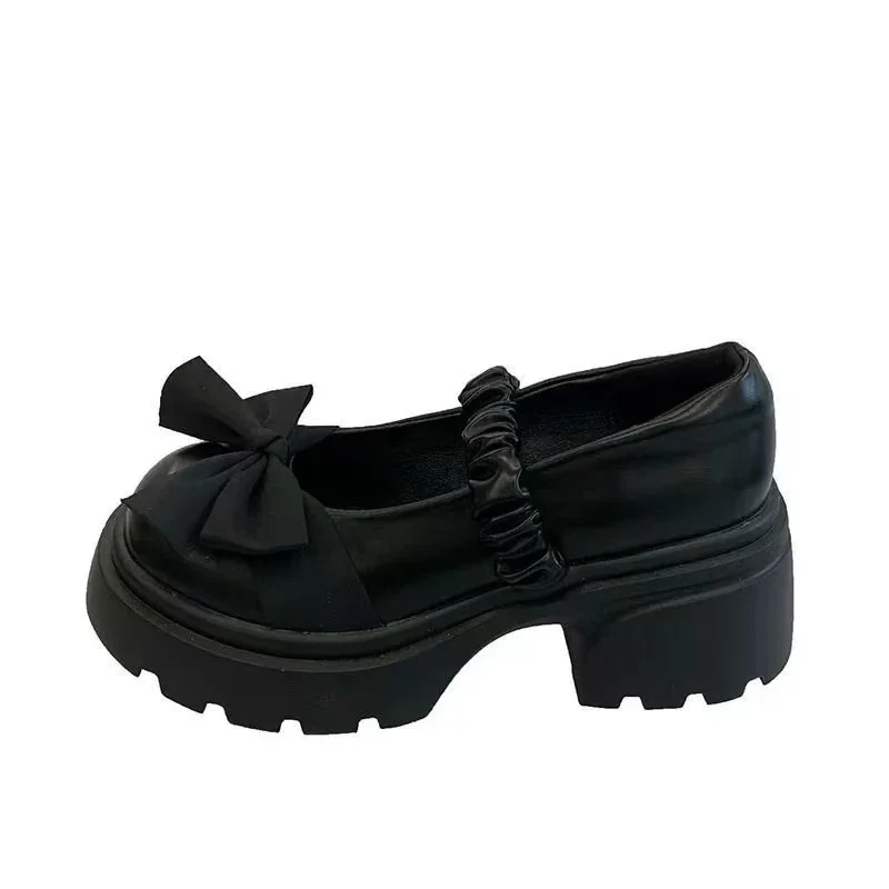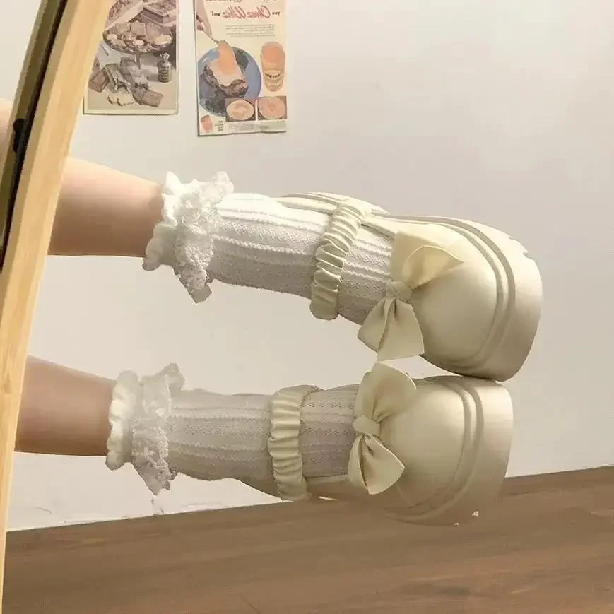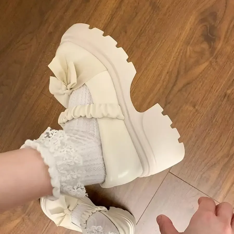 LIZAKOSHT - Chunky Platform High Heels Pumps Women Summer Leather Bow Mary Jane Shoes Woman Thick Heeled Off White Black Lolita Shoes