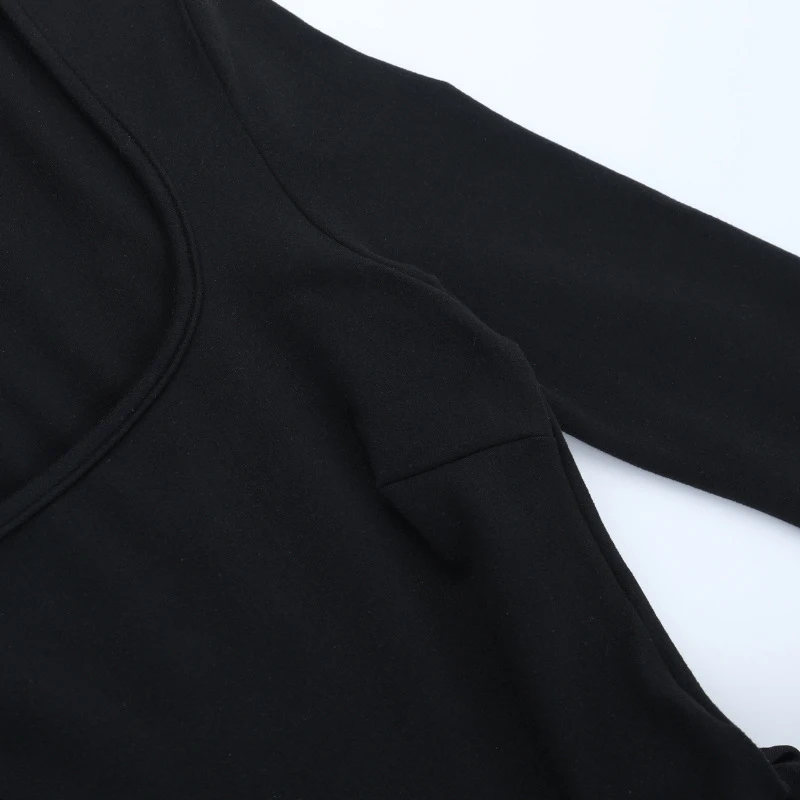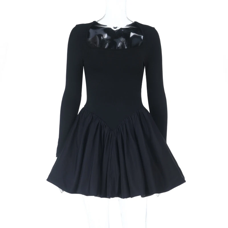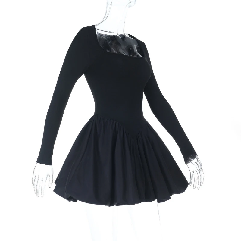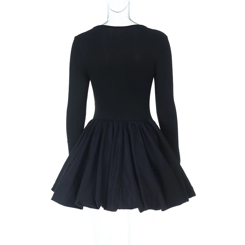 LIZAKOSHT - Classic Black Princess Fluffy Dress For Women Elegant Crew Neck Long-sleeved High Waist Pleated Mini Gowns Party Streetwear