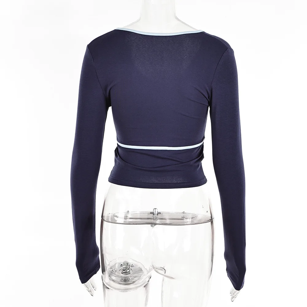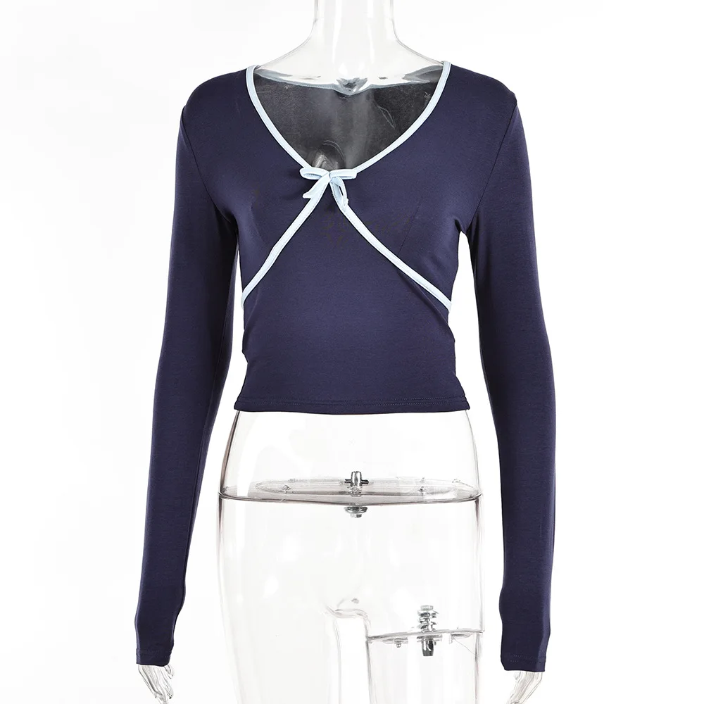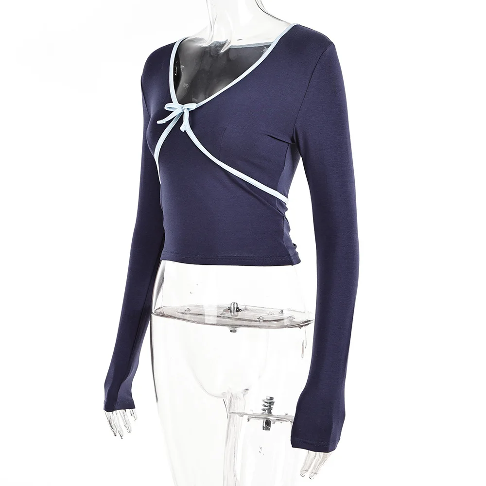 LIZAKOSHT Contrast V-Neck Tee Bow T-shirt Pullover Cropped Y2k Top Summer Elegant Long Sleeve Female Crop top Tee Cute T-Shirts New