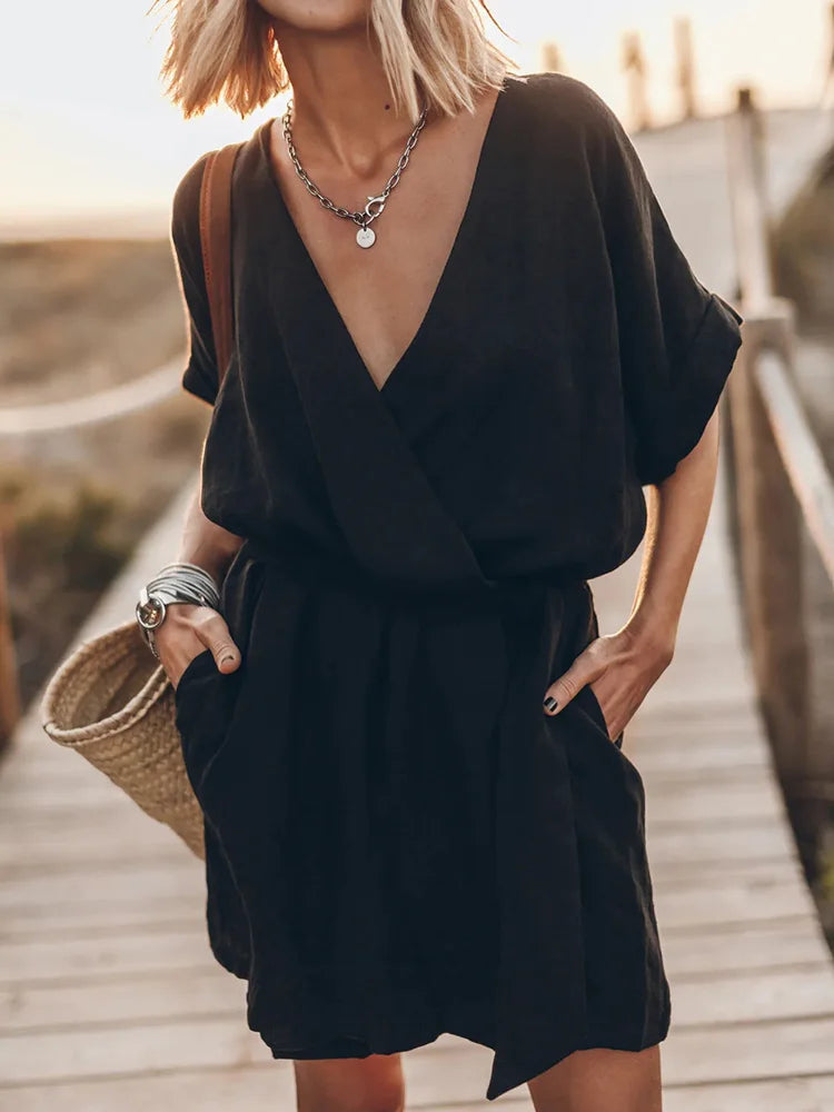 LIZAKOSHT - Cotton Linen V-Neck Loungewear Mini Dress, Women Summer Short Sleeve Solid Patchwork Party Dress, Lace-Up Elegant Ladies Dress