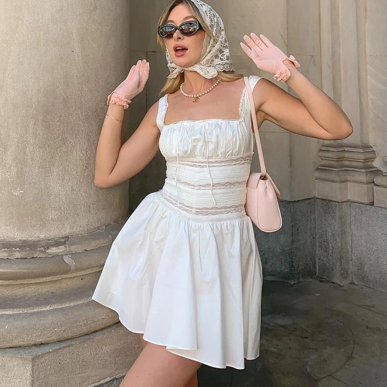 LIZAKOSHT - Cotton White Lace Strap Dress for Women Party Sexy Sleeveless High Waist Mini Dresses Summer Boho Beach Ruffles Vestidos