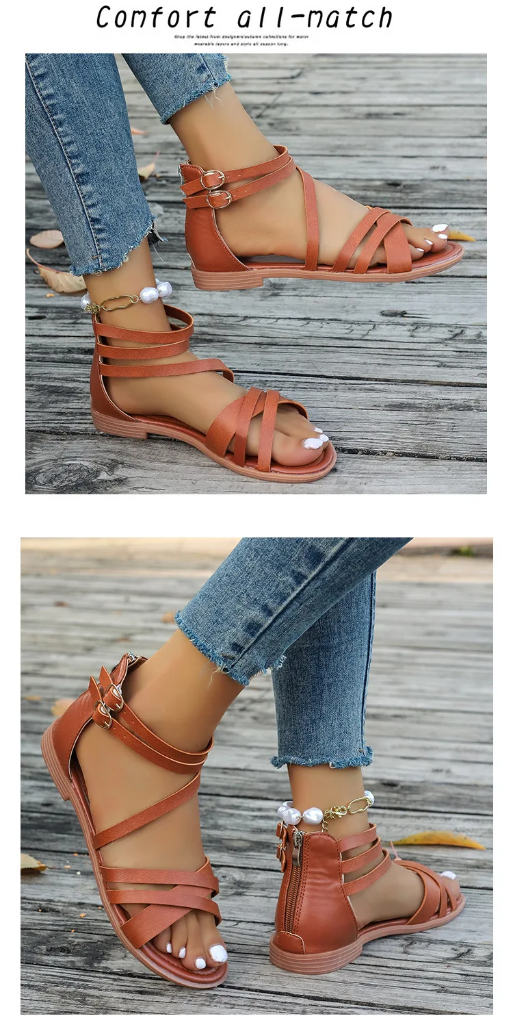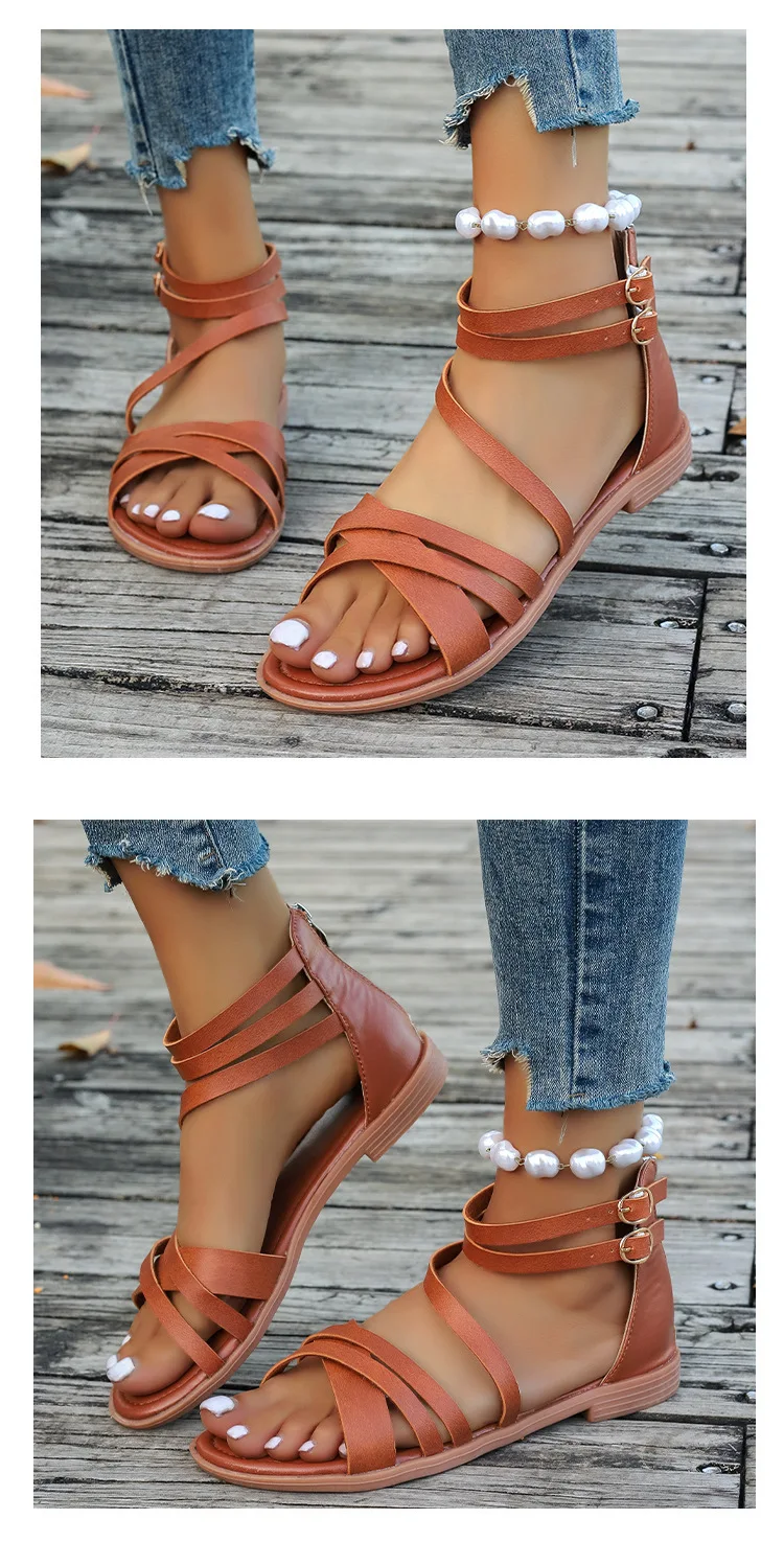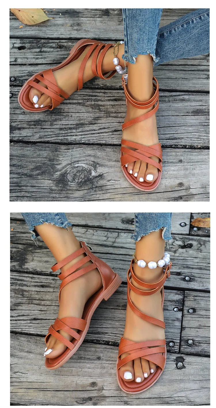 LIZAKOSHT - Cross Low Sandals Woman Leather Suit Female Beige Large Size Round Toe Shoes 2025 Summer Low-heeled Black Closed Fashion Big Bea