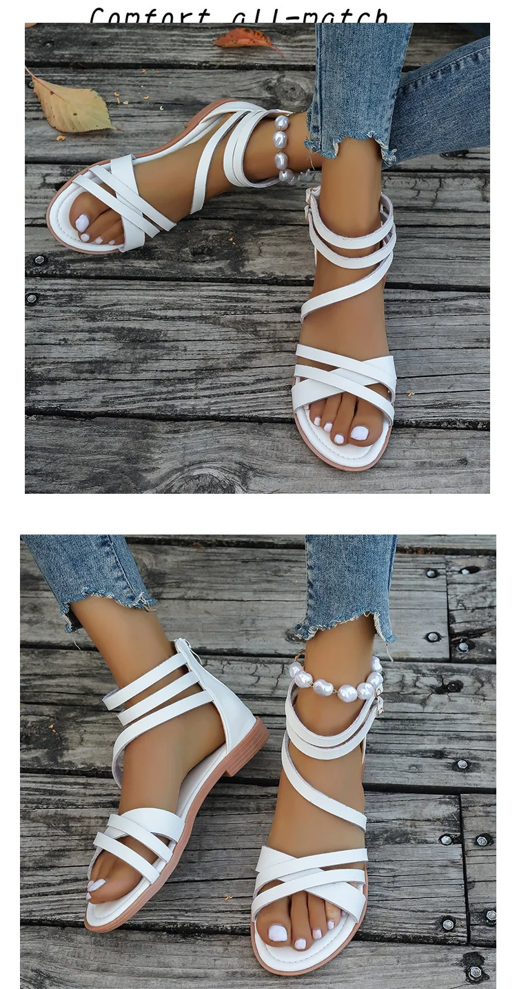 LIZAKOSHT  -  Cross Low Sandals Woman Leather Suit Female Beige Large Size Round Toe Shoes 2025 Summer Low-heeled Black Closed Fashion Big Bea