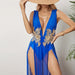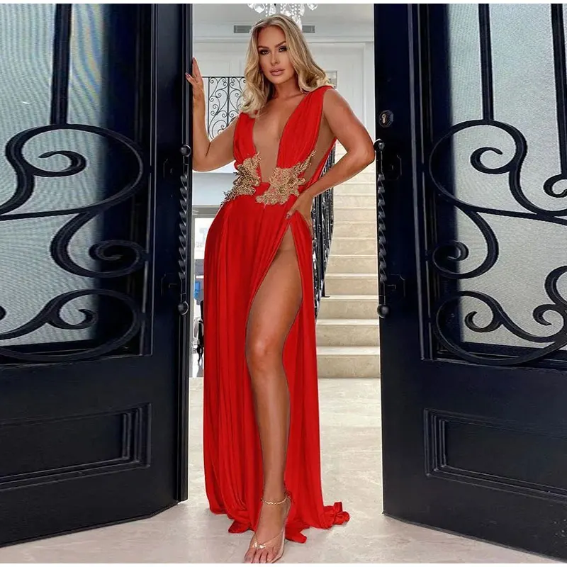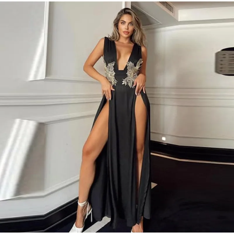 LIZAKOSHT - Deep V Print Long Dress For Women Sleeveless Side Split Waist Cinching Robes 2025 Summer Elegant Female Evening Party Dresses