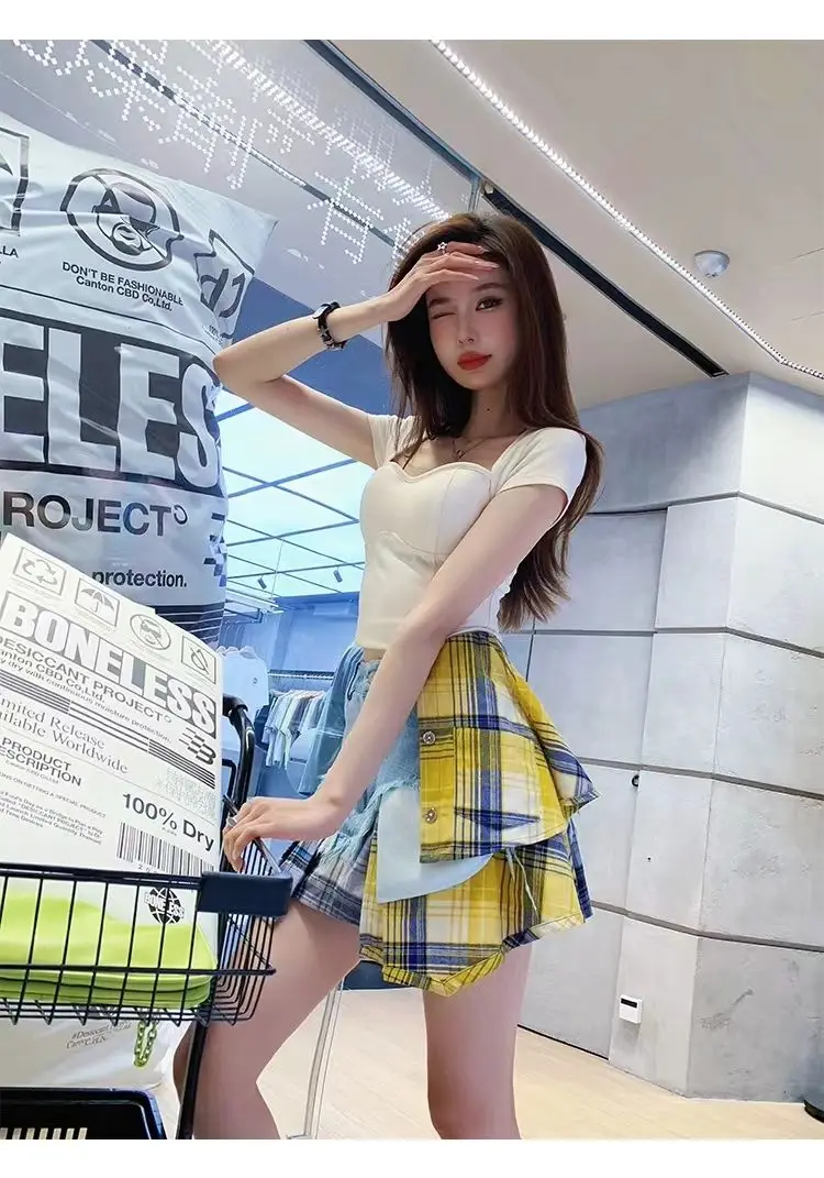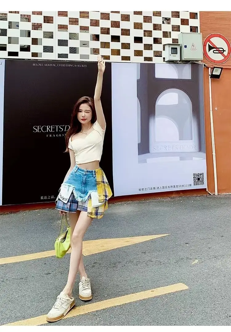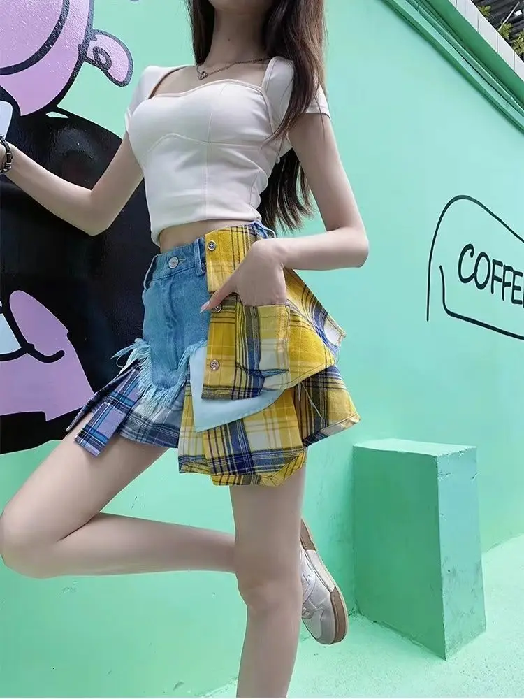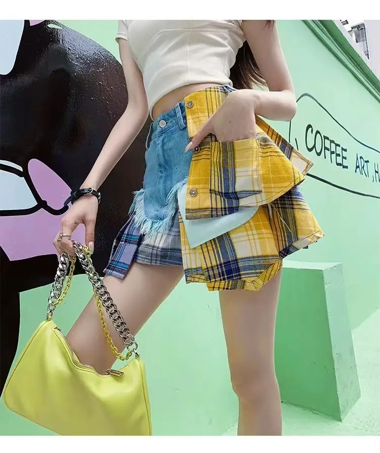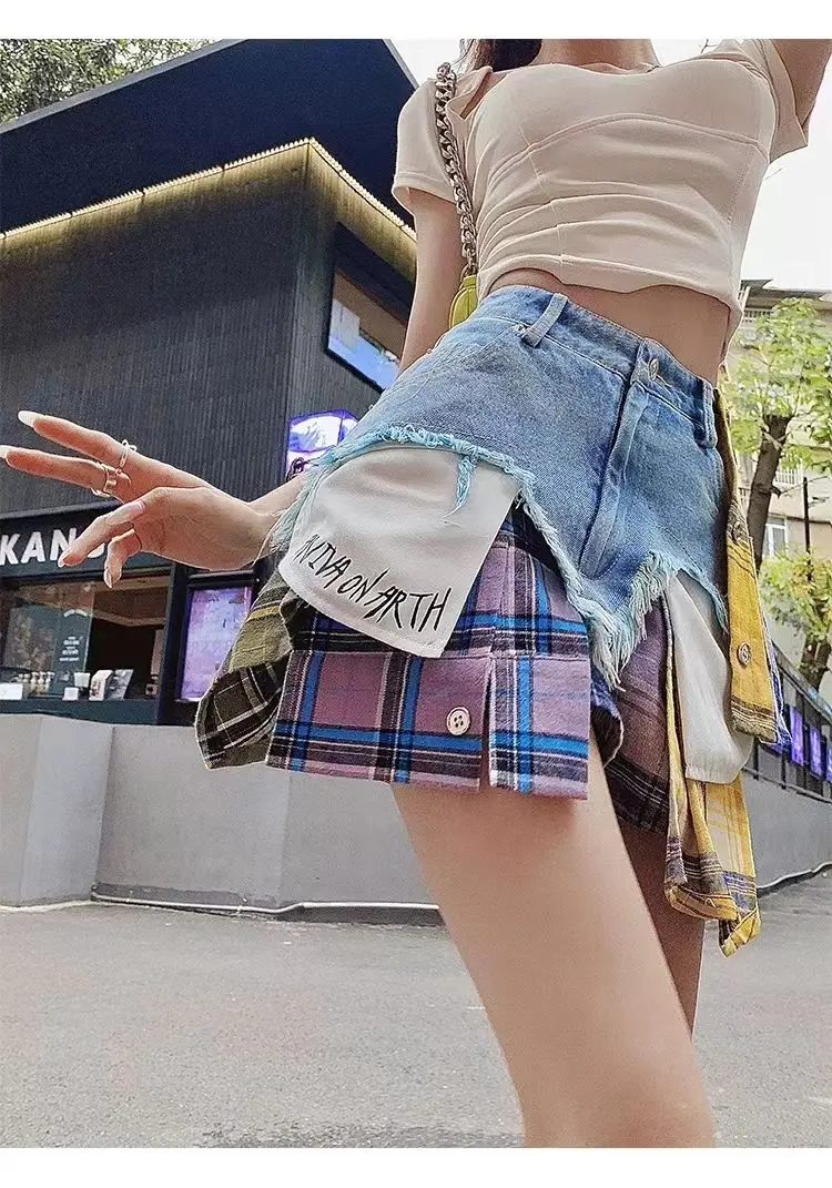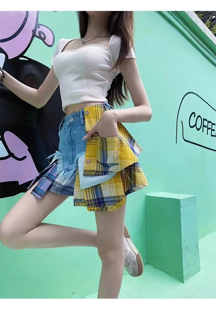 LIZAKOSHT - Denim Skirt Colored Plaid Patchwork Irregular Deconstructed Women'S A-Line High Waist Mini Skirt 2024 Summer New Fashion