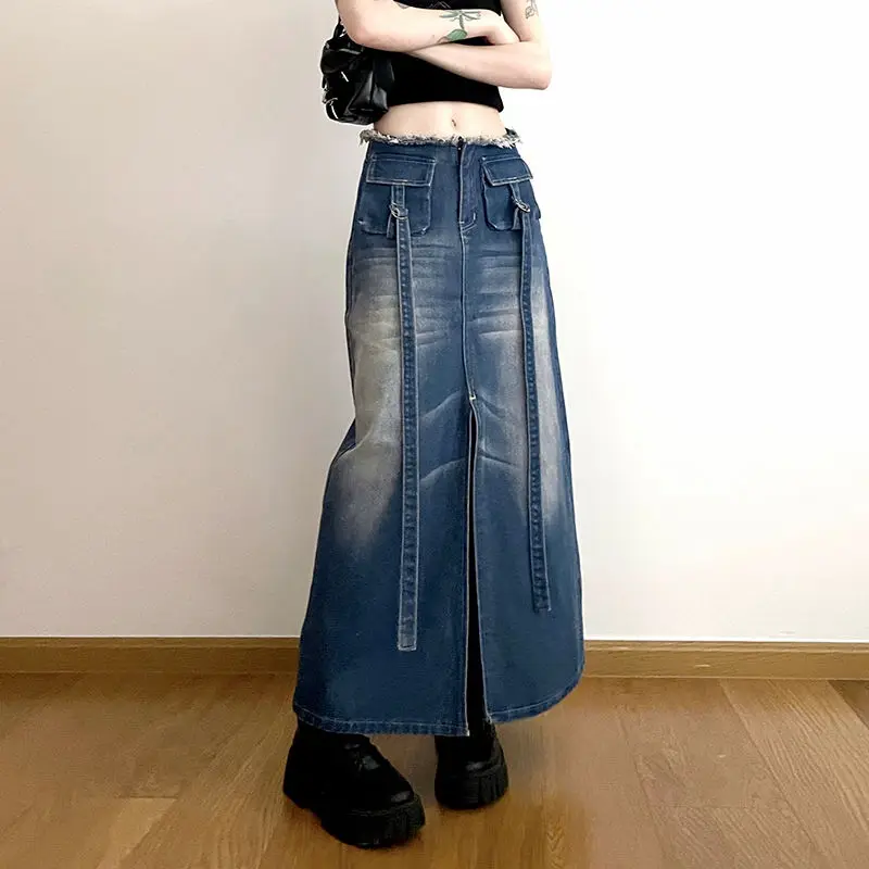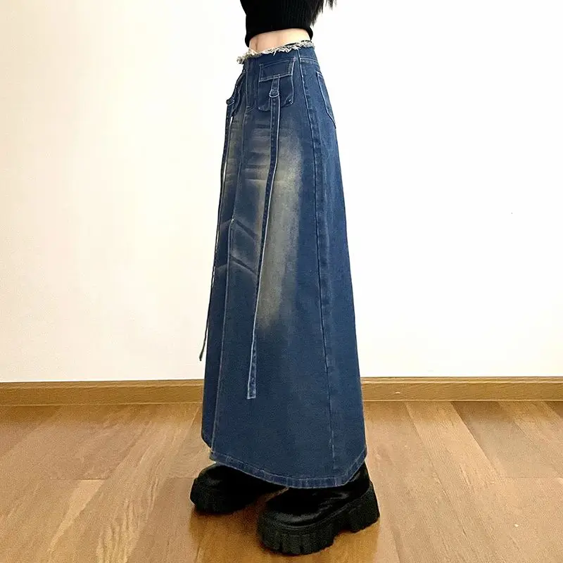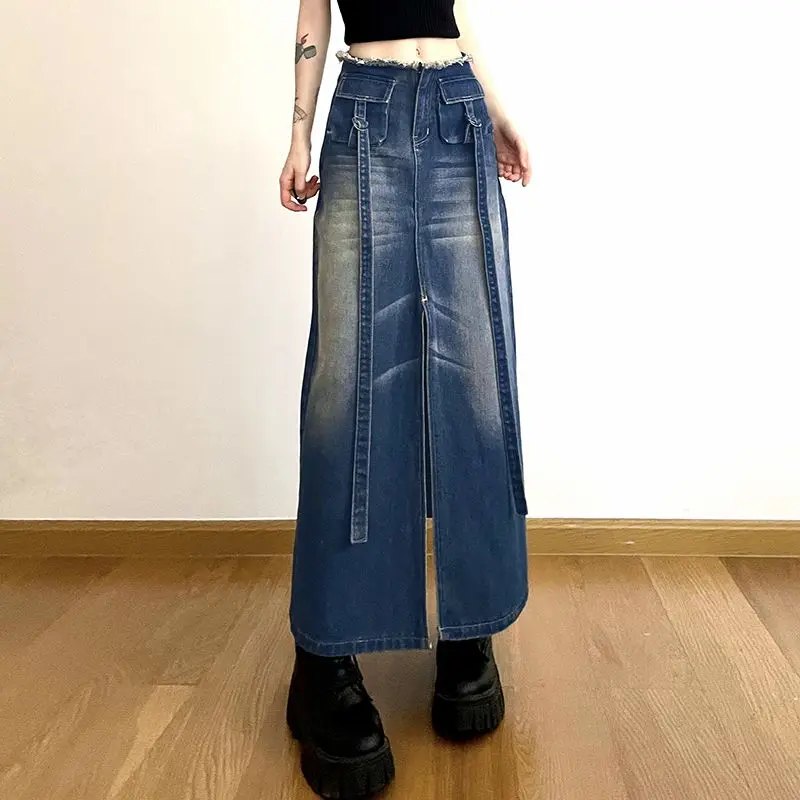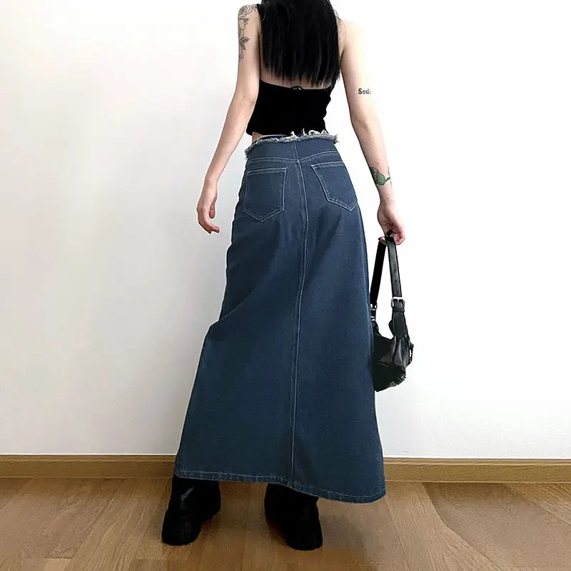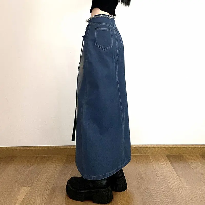 LIZAKOSHT - Denim Skirt Streamer Slit Long Skirt Burr High Waist Slim European And American Spice Girls A-Line Skirt Tide