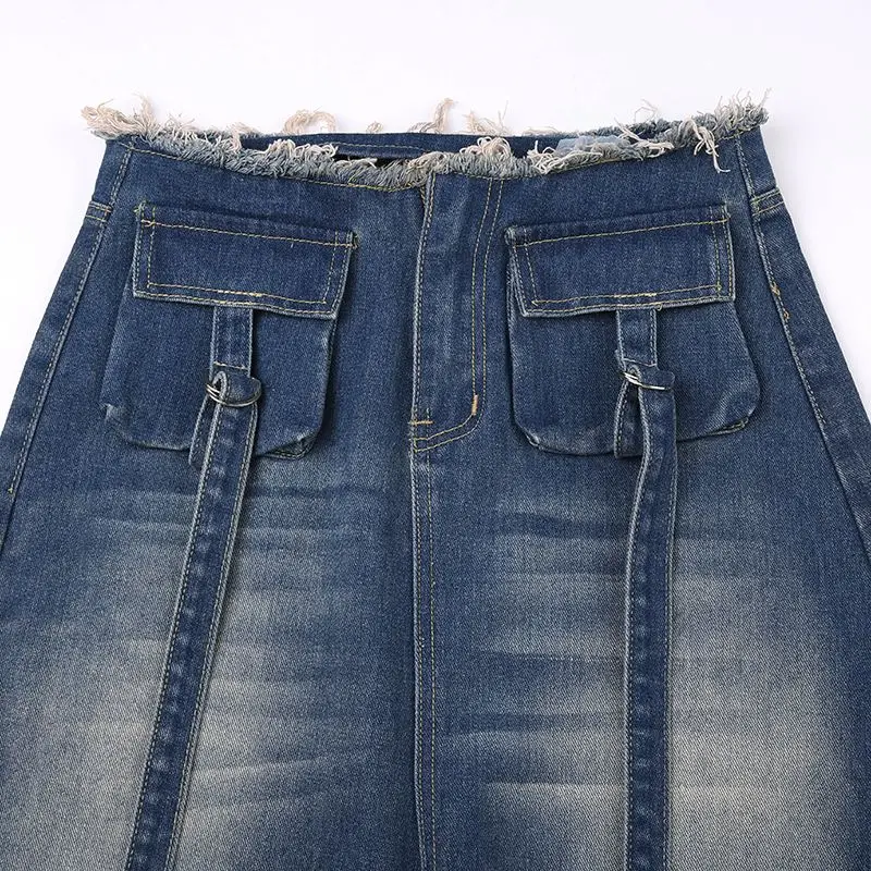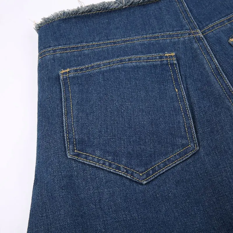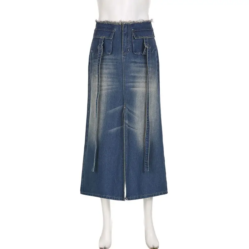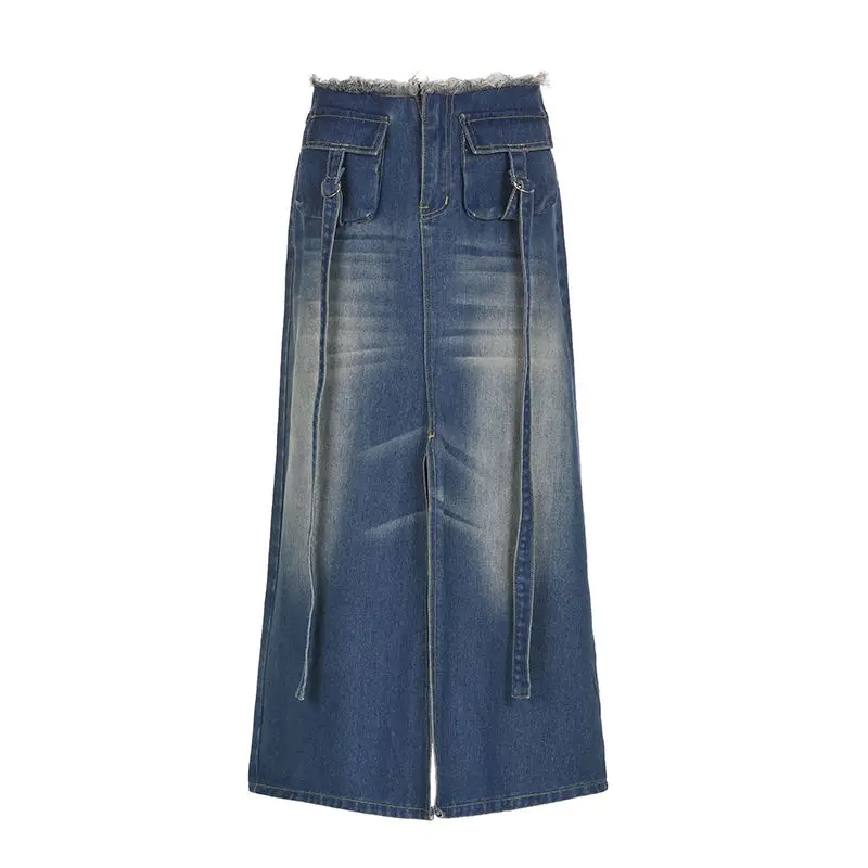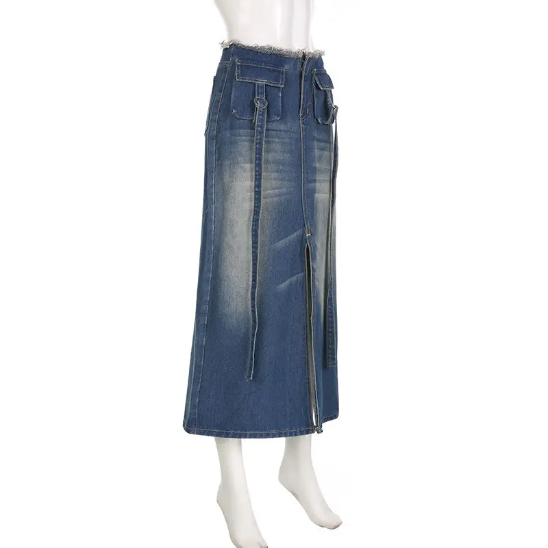 LIZAKOSHT - Denim Skirt Streamer Slit Long Skirt Burr High Waist Slim European And American Spice Girls A-Line Skirt Tide