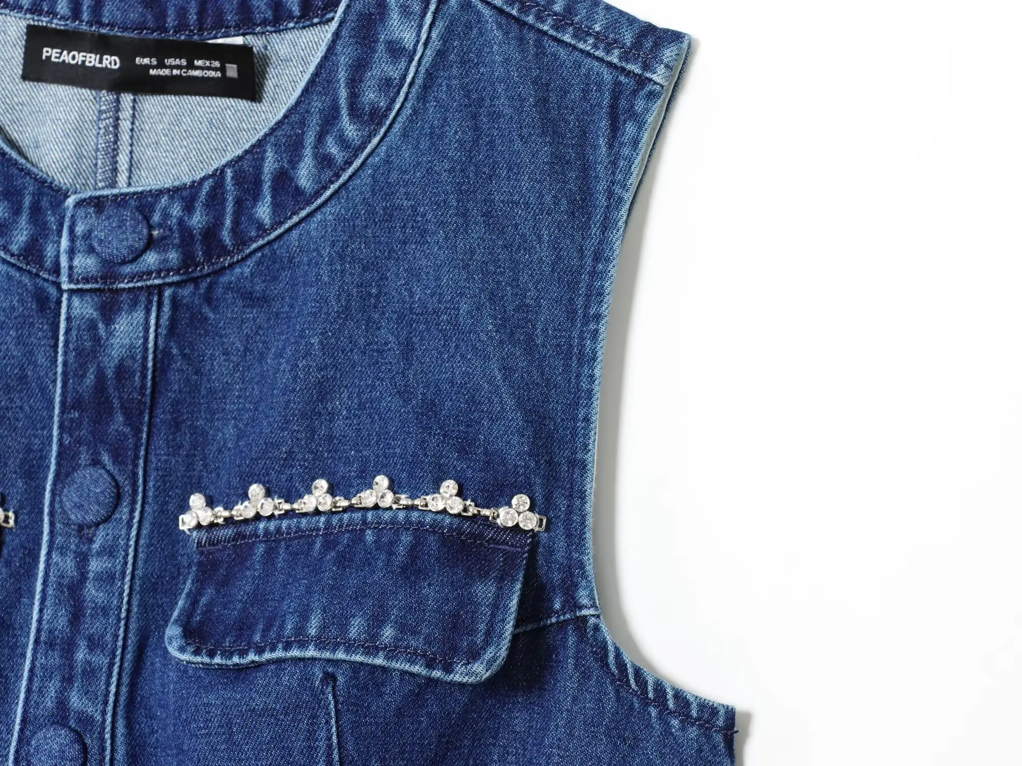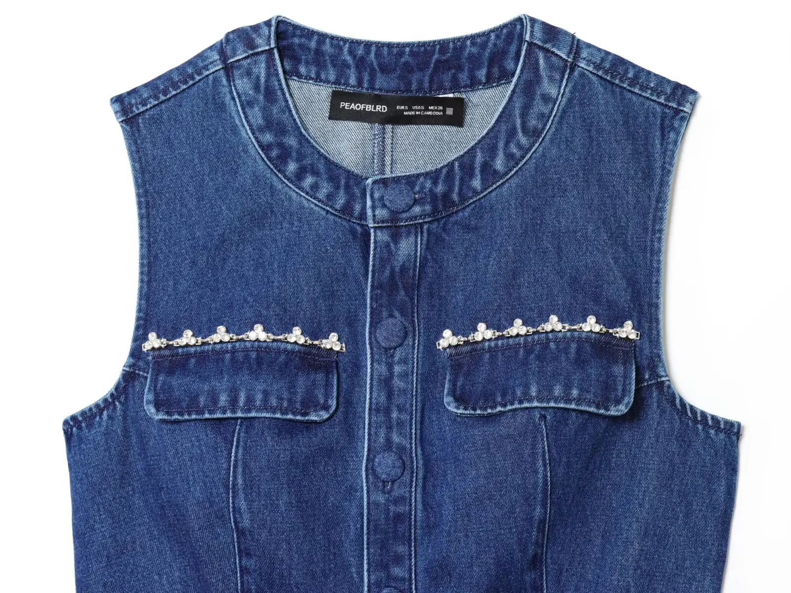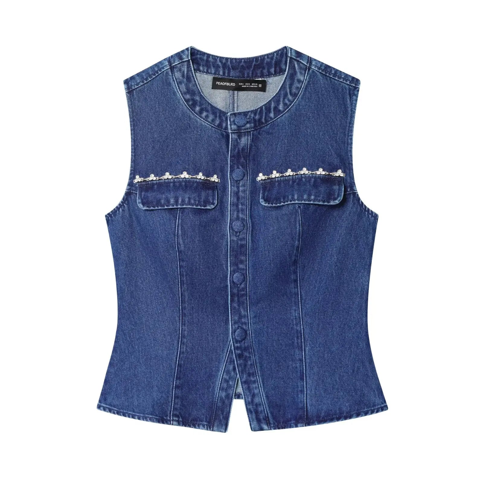 LIZAKOSHT  -  Denim Vests Jackets Autumn Women's 2025 New Slim O-neck Beaded Elegant Women Jackets Chic Street Youth Casual Denim Jacket Vests