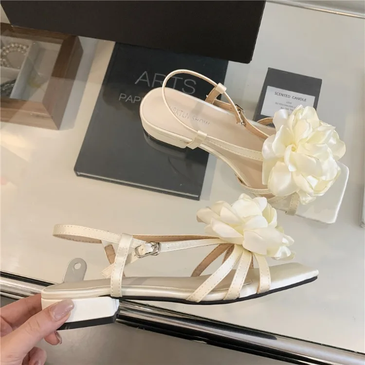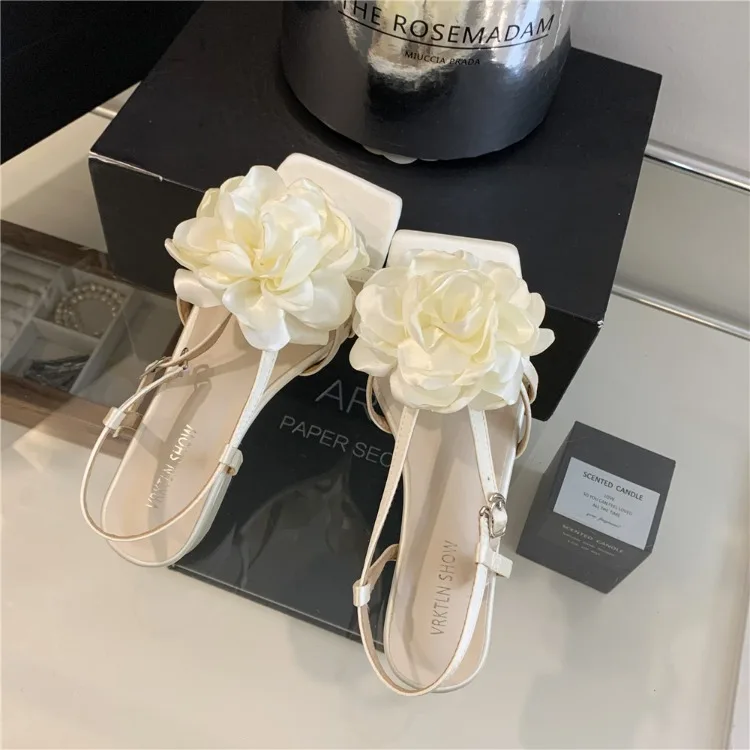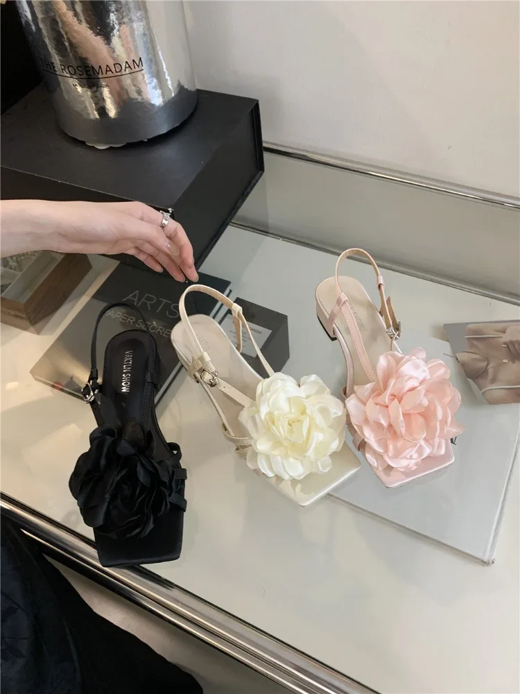 LIZAKOSHT - Designer Flower Sandals for Women Summer New Fashion Slingback Shoes Skirt Shallow Elegant Square Toe Low Heel Slippers Women