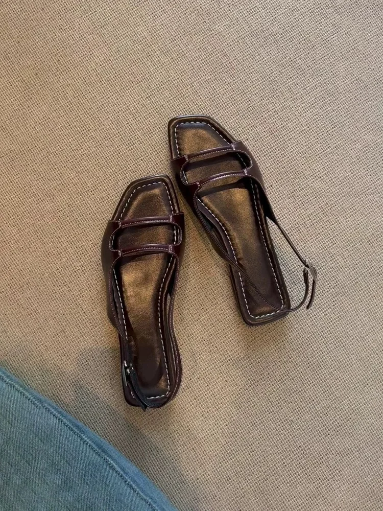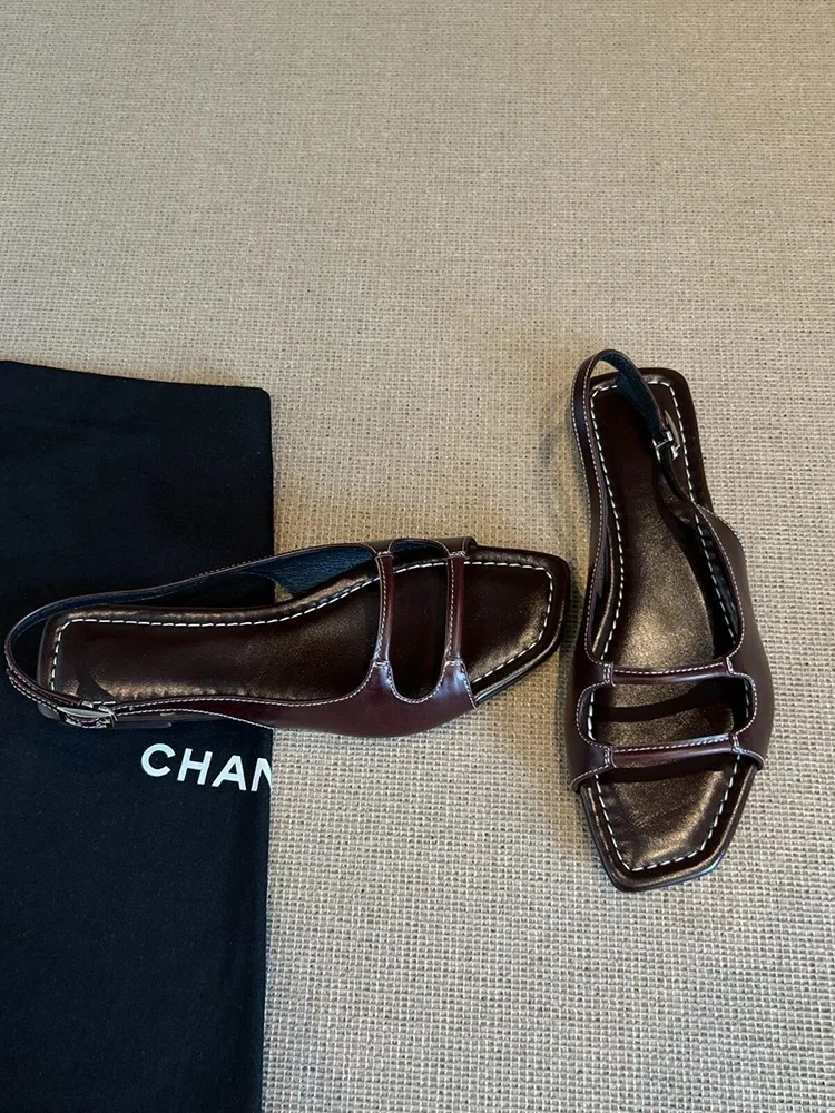 LIZAKOSHT - Designer Retro Summer Buckle Sandals French Elegant Women Flat Sandals Beach Square Toe Roman Shoes Ladies