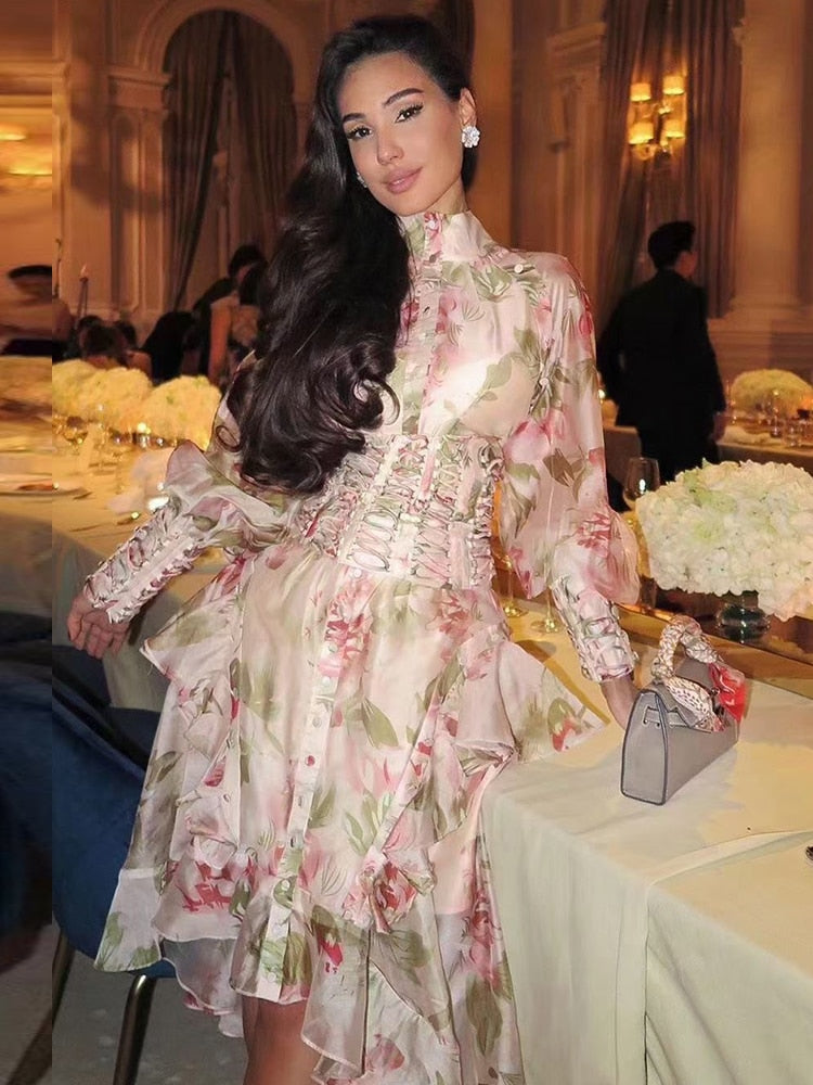 Lizakosht Designer's vintage print button-up long-sleeved dress Women's new fall fashion luxury loose peplum irregular pompadour dress