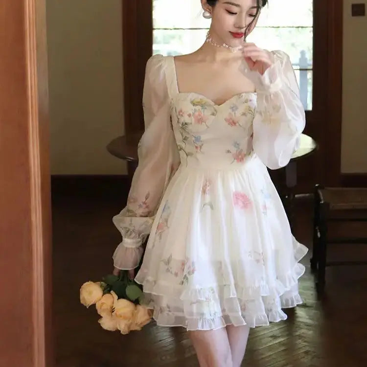 LIZAKOSHT - Dress Printed Square Neck Long Sleeve Plus Size Women'S Fat Mm French Spring And Summer Waist Slimming Cake Skirt Floral Skirt
