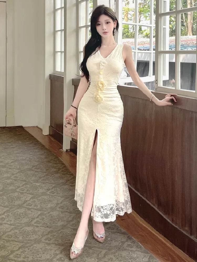 LIZAKOSHT - Elegant Dresses Women Flowers Lace Patchwork Sleeveless Halter Slim Split Temperament Party Dress Summer Fashion