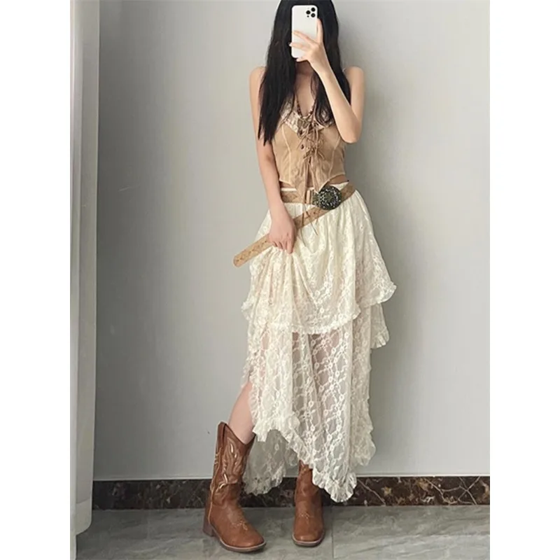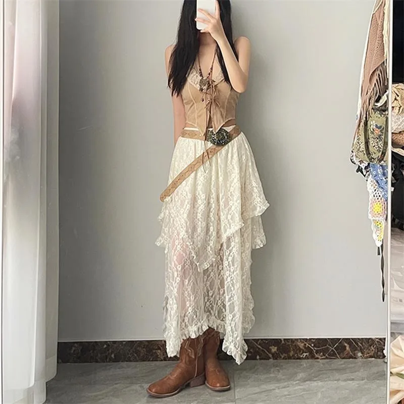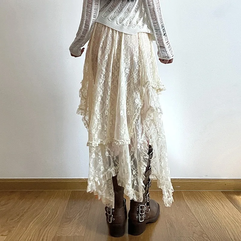 LIZAKOSHT  -  Elegant Fashion Vintage Chic Irregular Hem A-line Skirts Holiday Skirts for Women Vintage Ruffles Floral Kintted Lace Streetwear