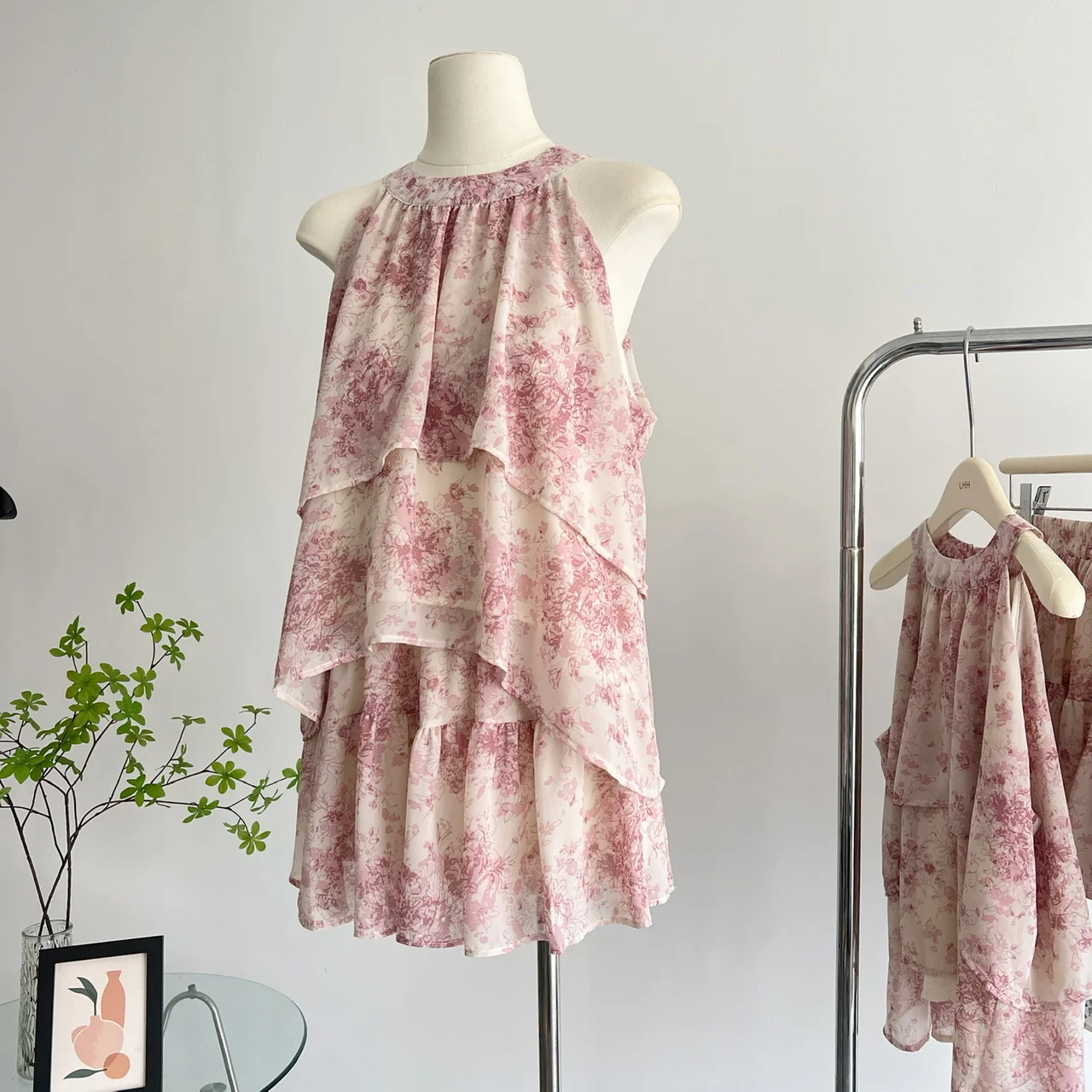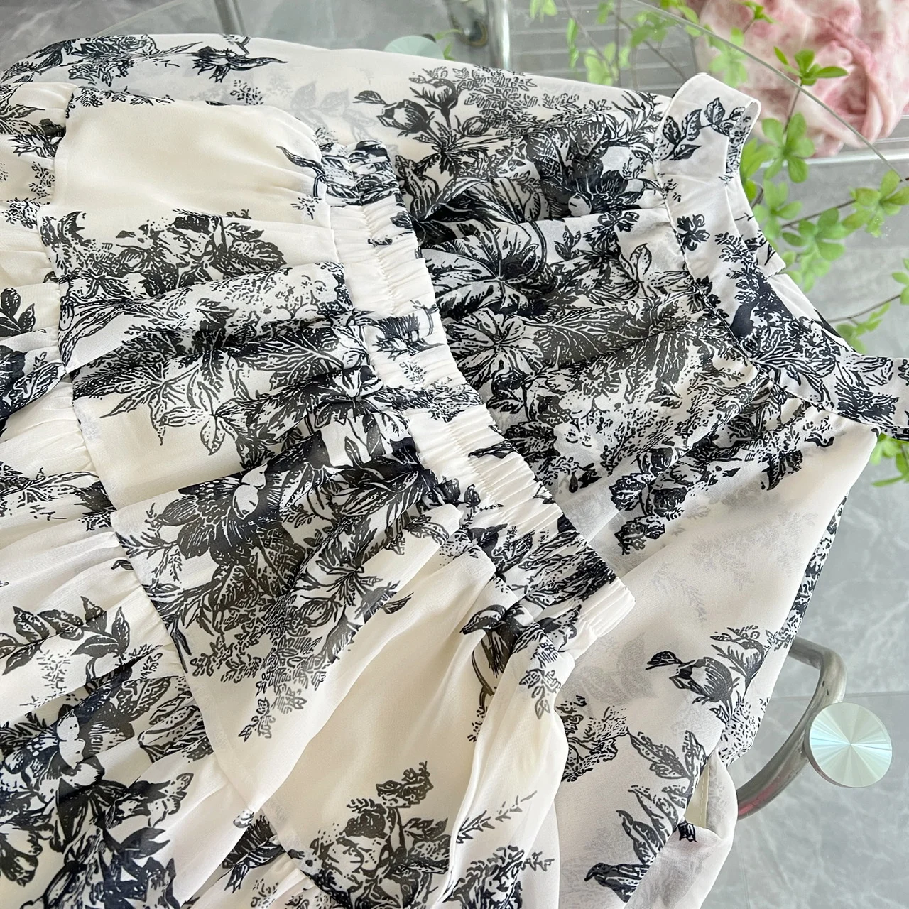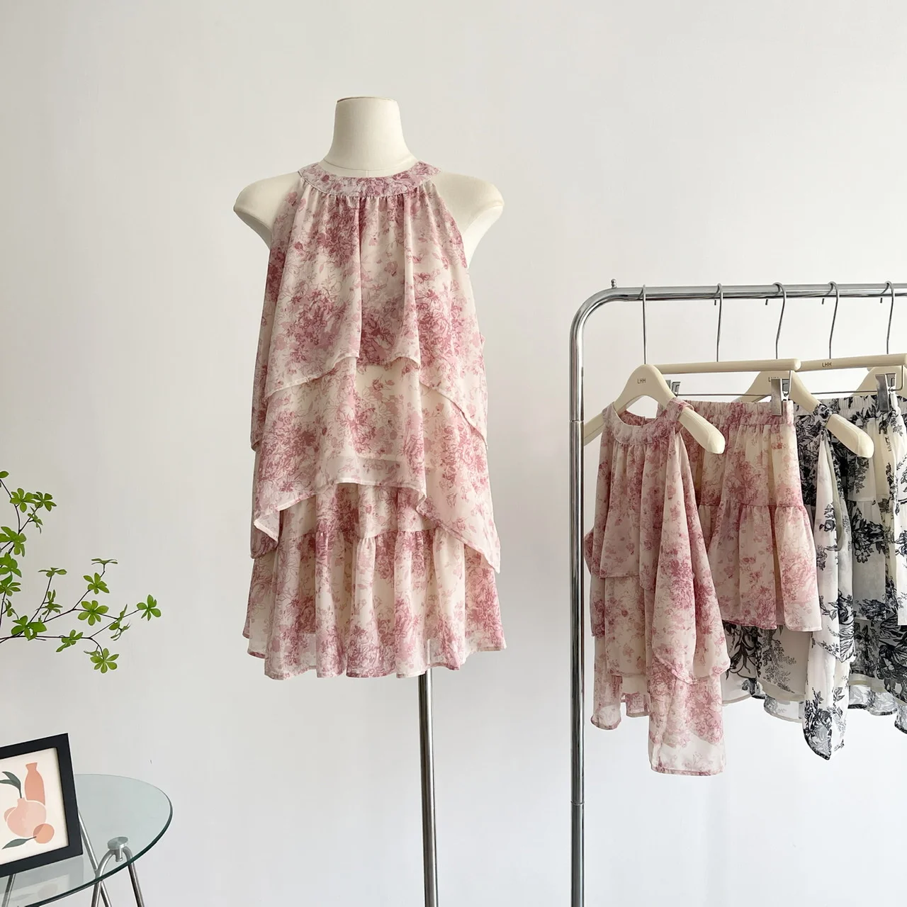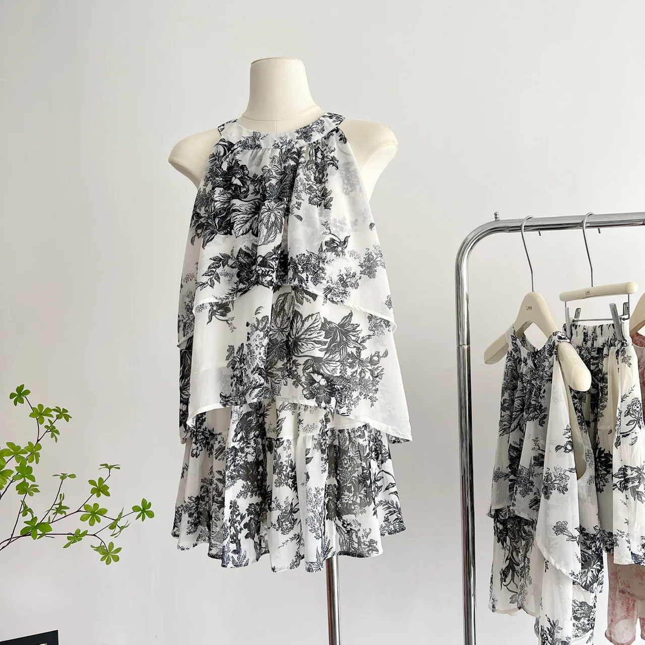 Lizakosht Elegant Ink Printed Skirt Suit Halter Swing Sleeveless Ruffles Top + Mini Pleated Skirt Casual Fashion Summer Two-piece Outfit
