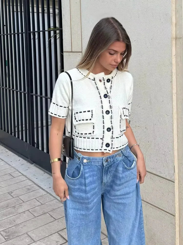 LIZAKOSHT - Elegant Knitted Cardigan Coat Women Fashion Single-Breasted Pockets Short Sleeve Crop Sweater 2025 New Summer Casual Slim Tops