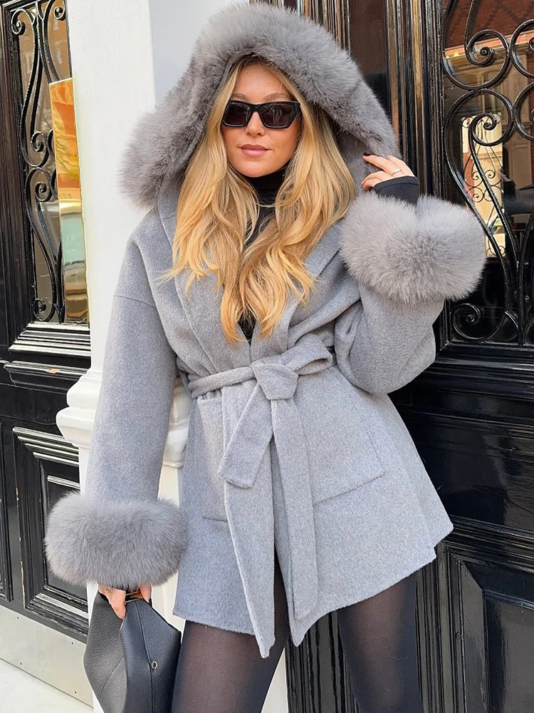 LIZAKOSHT  -  Elegant Lace Up Fur Patchwork Coat Women Loose Solid Long Sleeve V-neck Open Stitch Coats Female Autumn Fashion Jacket
