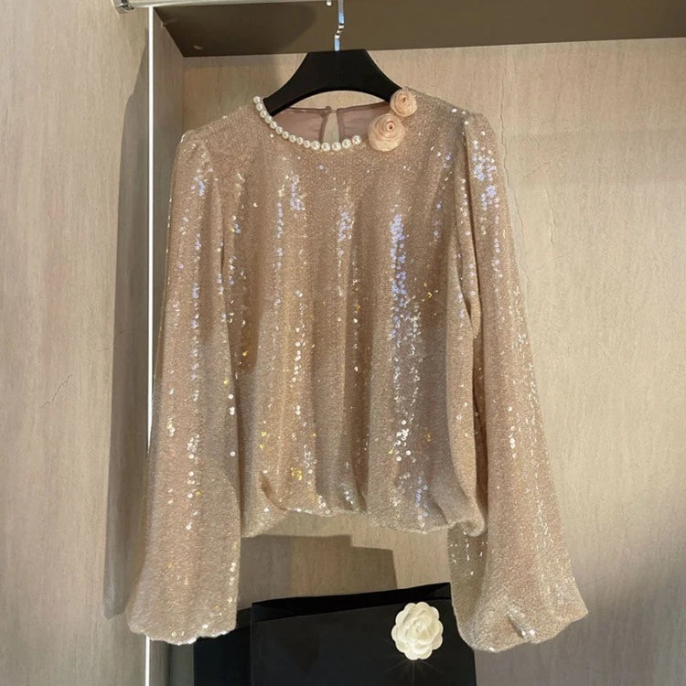 LIZAKOSHT  -  Elegant O-neck Long Sleeve Pink Bloues Spring Autumn New Loose Shirts Women Fashion All-match 3D Pearl Blusas Mujer