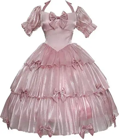 LIZAKOSHT - Elegant Pink Gothic Multi Layered Tower Skirt Sexy Off Shoulder Dress with Bow Loose Sleeve Dress Customized with Glass Satin