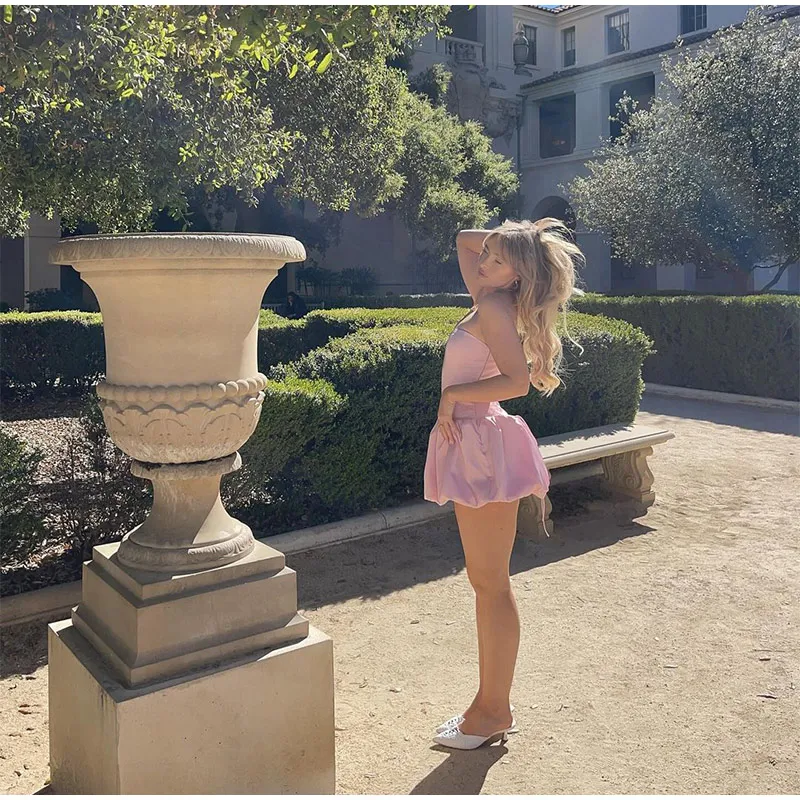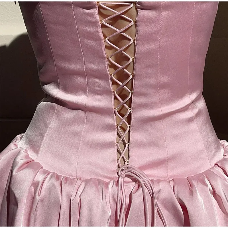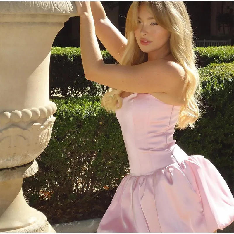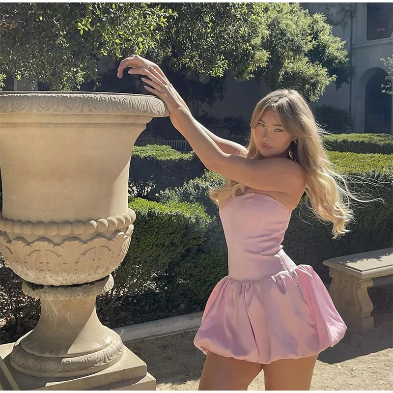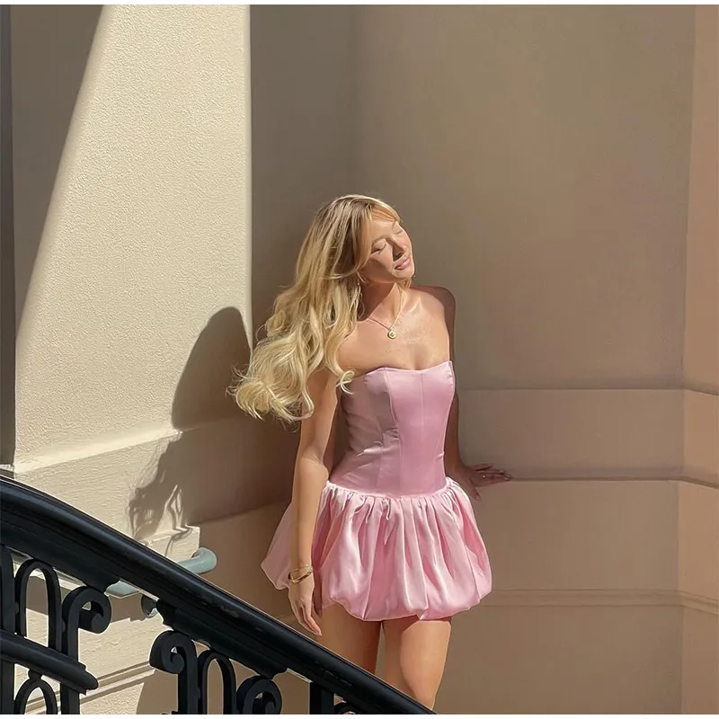 LIZAKOSHT - Elegant Pink Strapless Women Mini Dress Fashion Backless Sleeveless Pleated Hem Dresses 2024 Summer Lady Slim Party A-line Robes