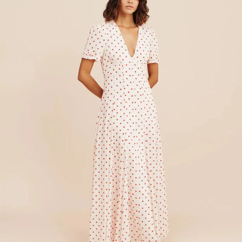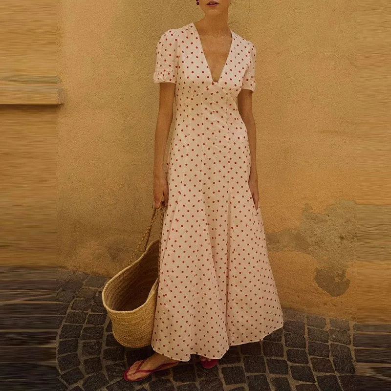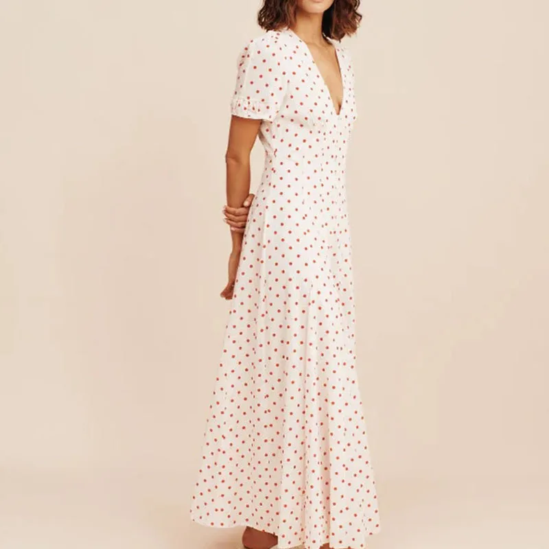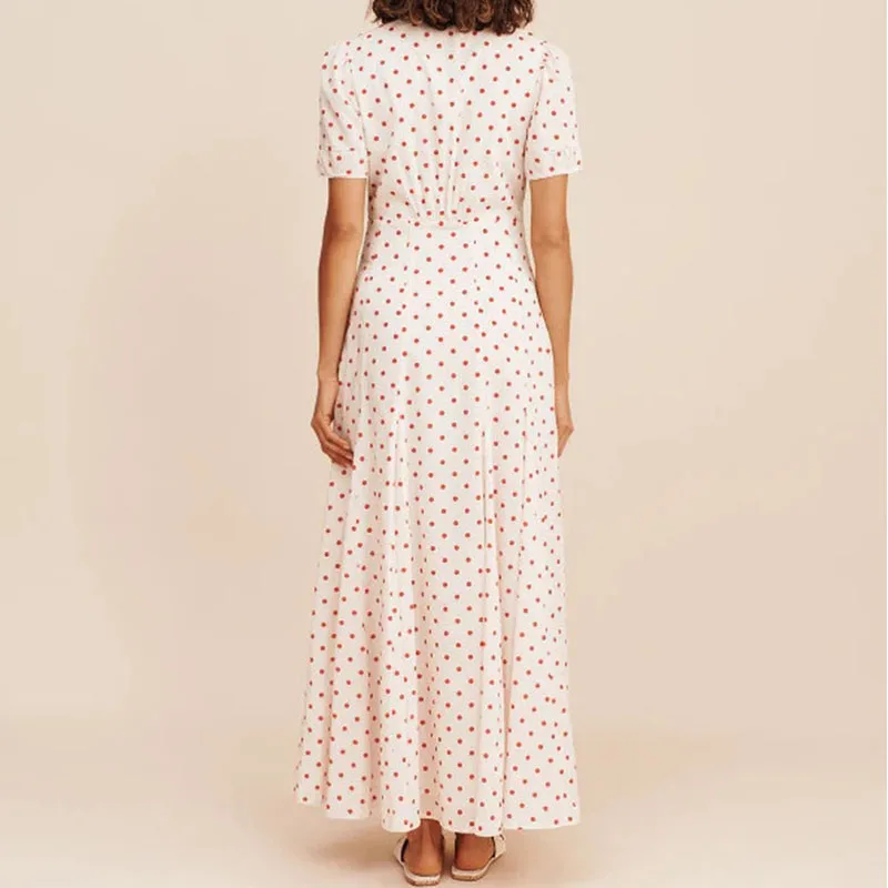 LIZAKOSHT  -  Elegant Polka Dot Printed Bohemian Women Long Dress Fashion Hight Wasit Party Dress V-neck Short Sleeve Seaside Vacation Dress