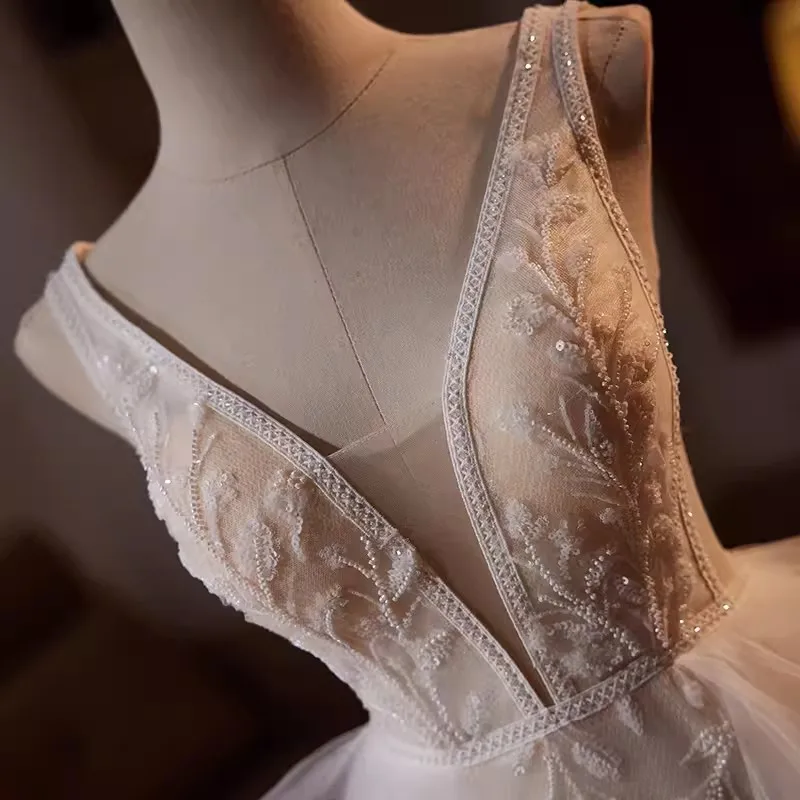 LIZAKOSHT - Elegant Real Picture Luxury Wedding Dresses With Tulle Train V Neck Sequined Applique Bridal Gowns Women Evening Formal Wear