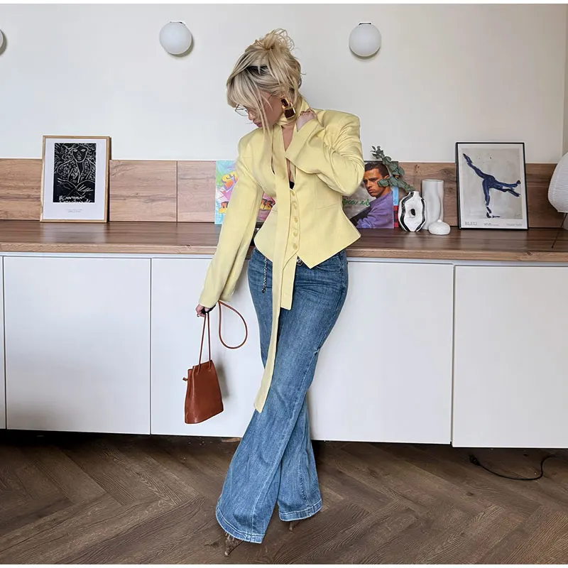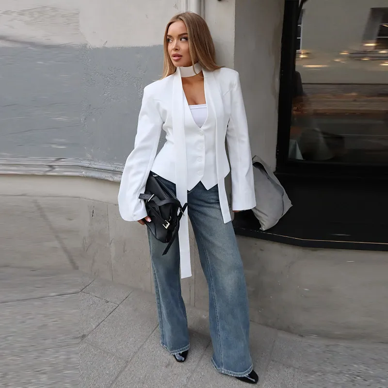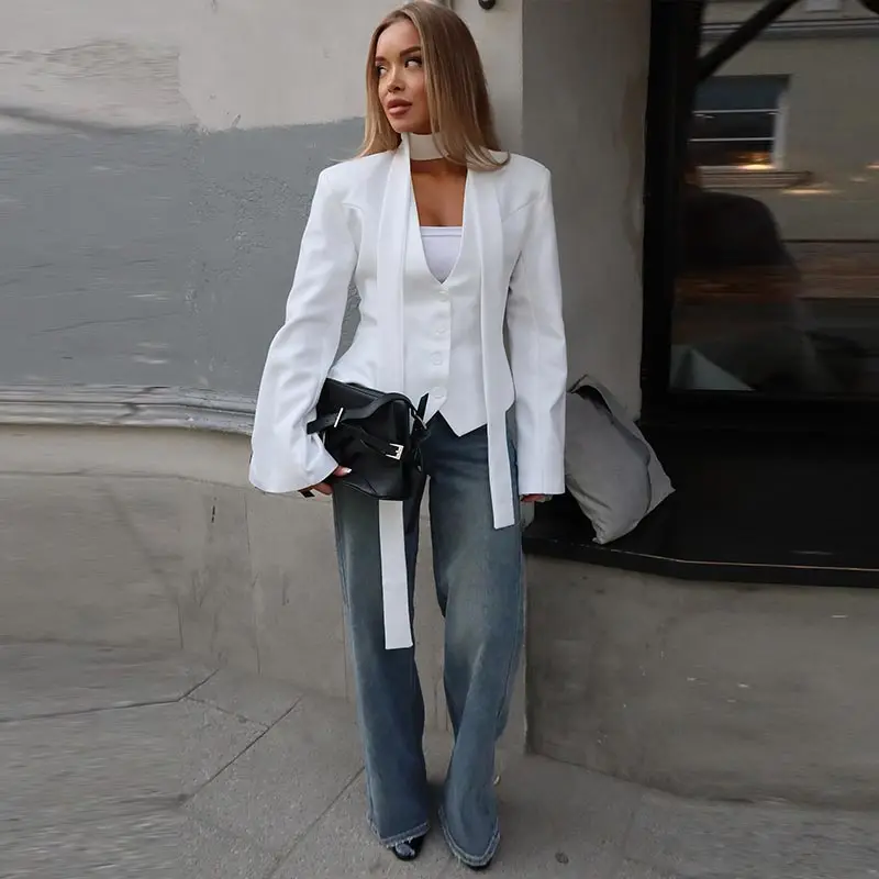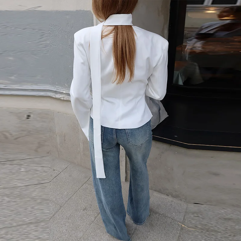 LIZAKOSHT - Elegant Ribbon Single Breasted Coat Women Fashion Solid V-neck Long Sleeve Pocket Jackets Female Autumn Chic Casual Streetwear