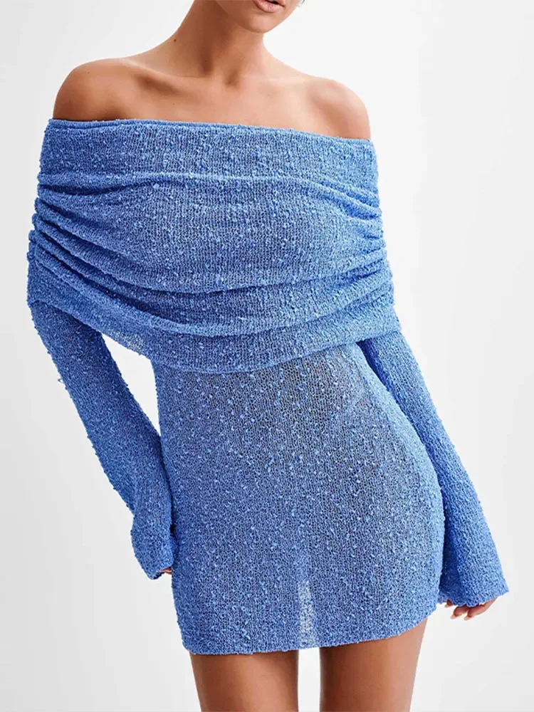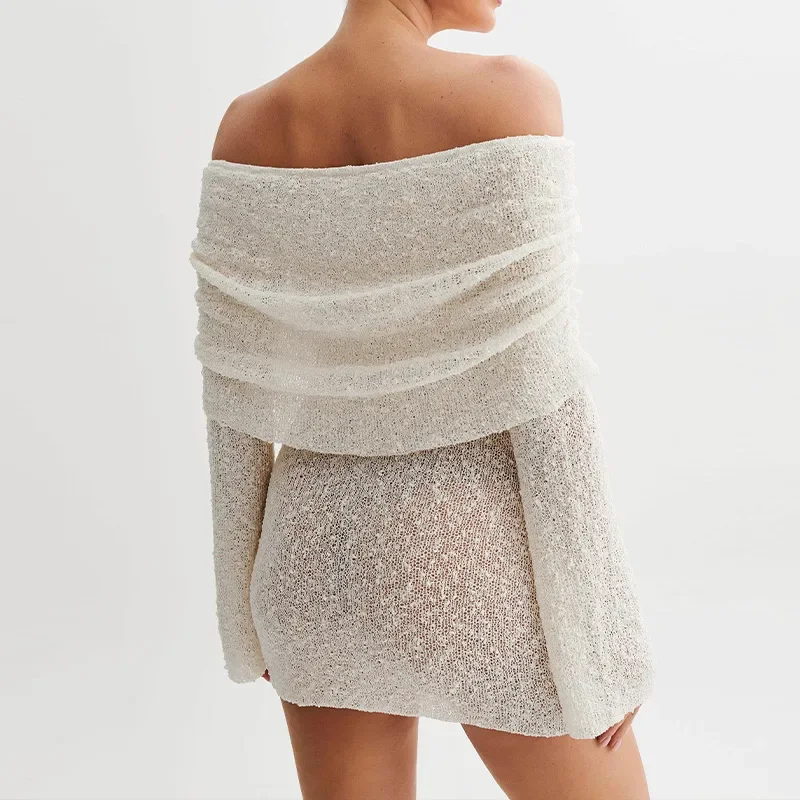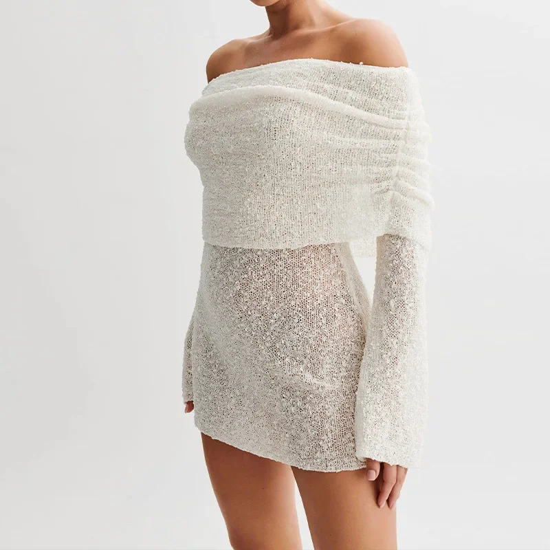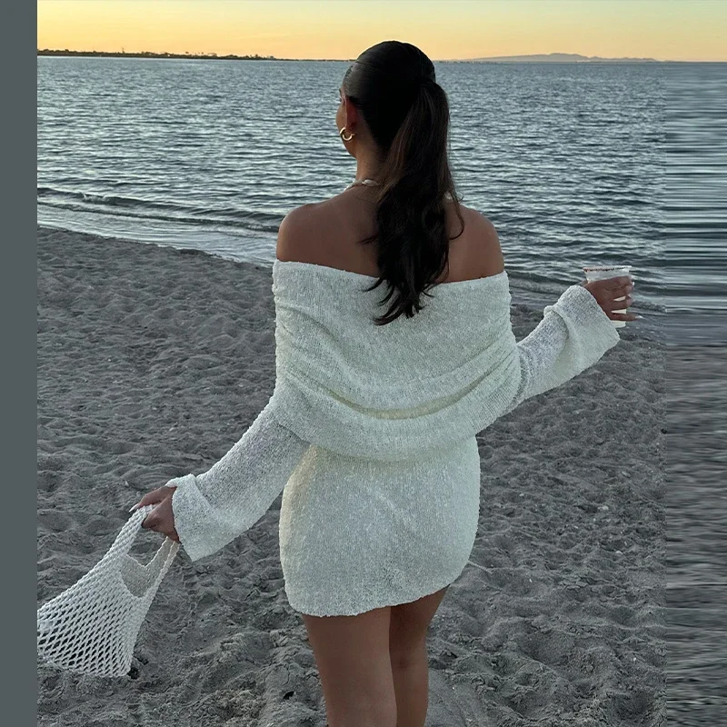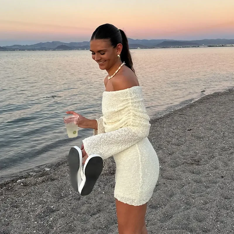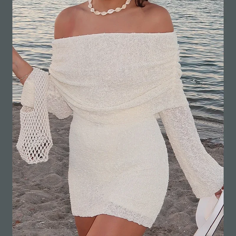 LIZAKOSHT - Elegant Solid Off Shoulder Women Mini Dress Fashion Backless Long Sleeve Bodycon Dresses 2024 Summer Lady Beach Vacation Robes
