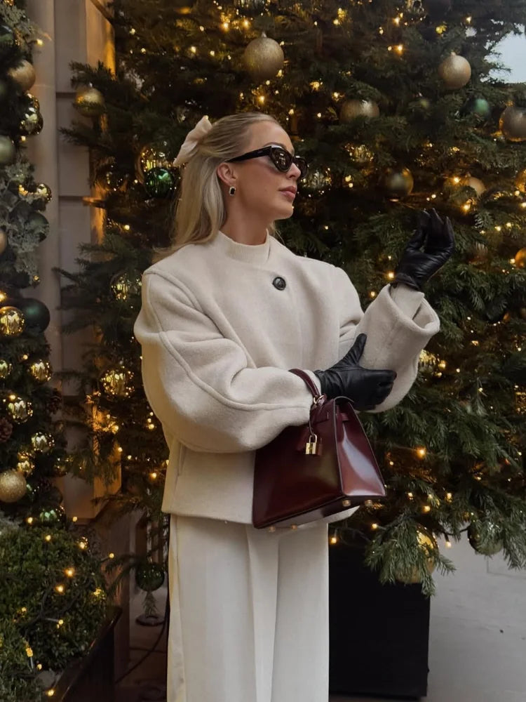 LIZAKOSHT  -  Elegant Solid One Buttons Women Woolen Coat Fashion O-neck Long Sleeve Short Jackets Autumn Female Chic High Street Outwear