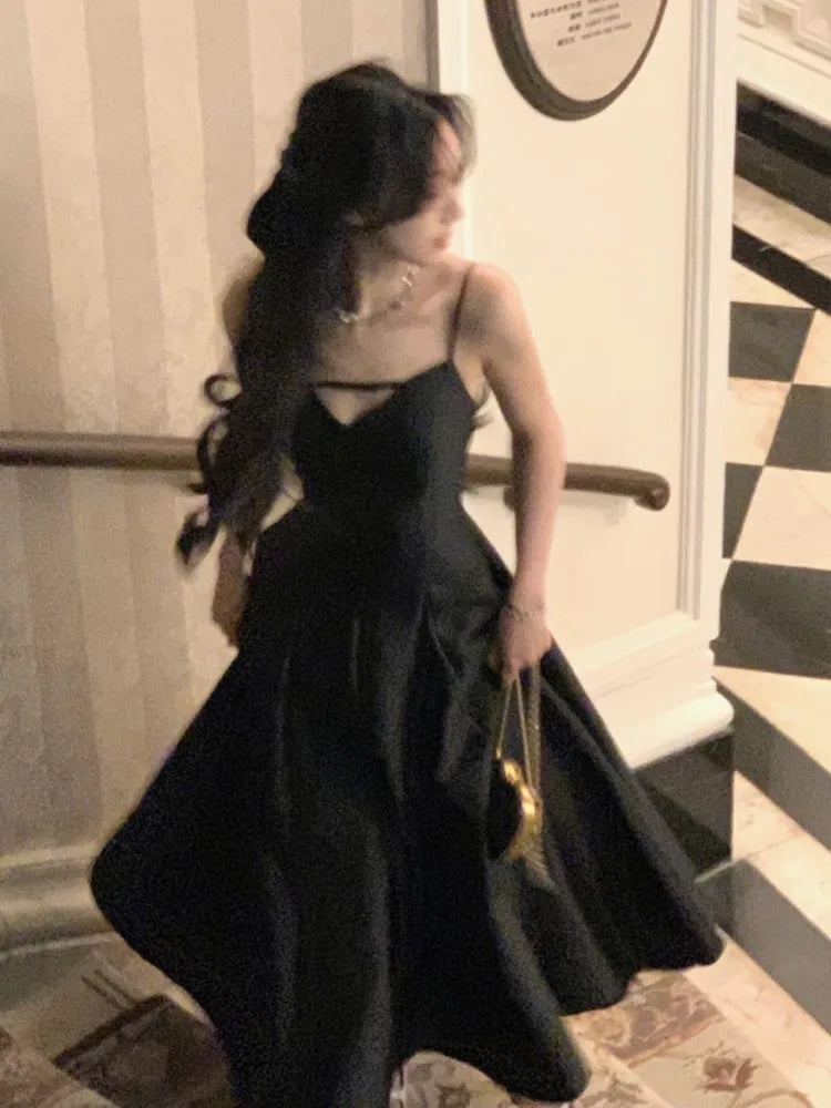 LIZAKOSHT - Elegant Solid Princess Evening Party Dress French Romantic Black Big Hem Graduation Dresses Korean Summer Strap Wedding Vestidos