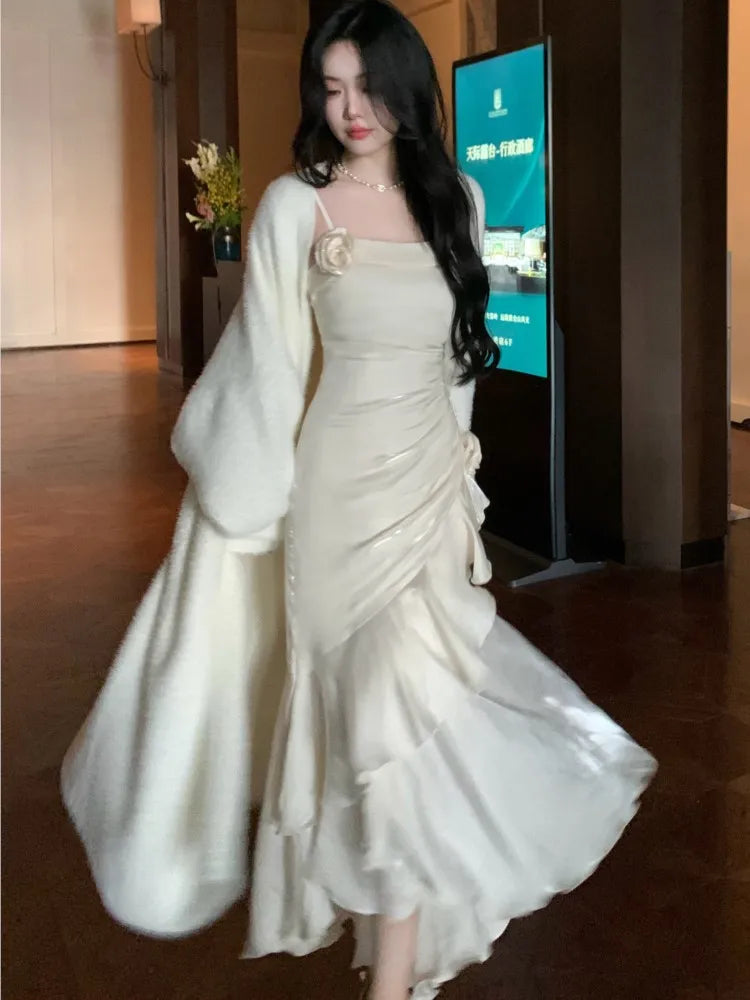 LIZAKOSHT - Elegant Spaghetti Strap Ruffles Mermaid Dress Long Sleeve Knitted Long Coat Korean Fashion Evening Party Clothing Autumn Winter