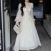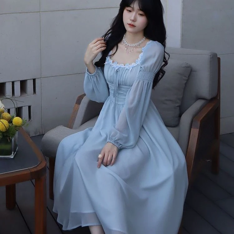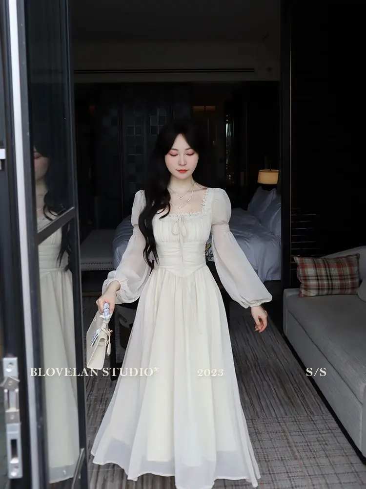 LIZAKOSHT - Elegant Square Collar Chiffo Dresses 2025 New Long Sleeve Dress for Women Y2k Early Autumn Slim Waist Vestidos De Mujer