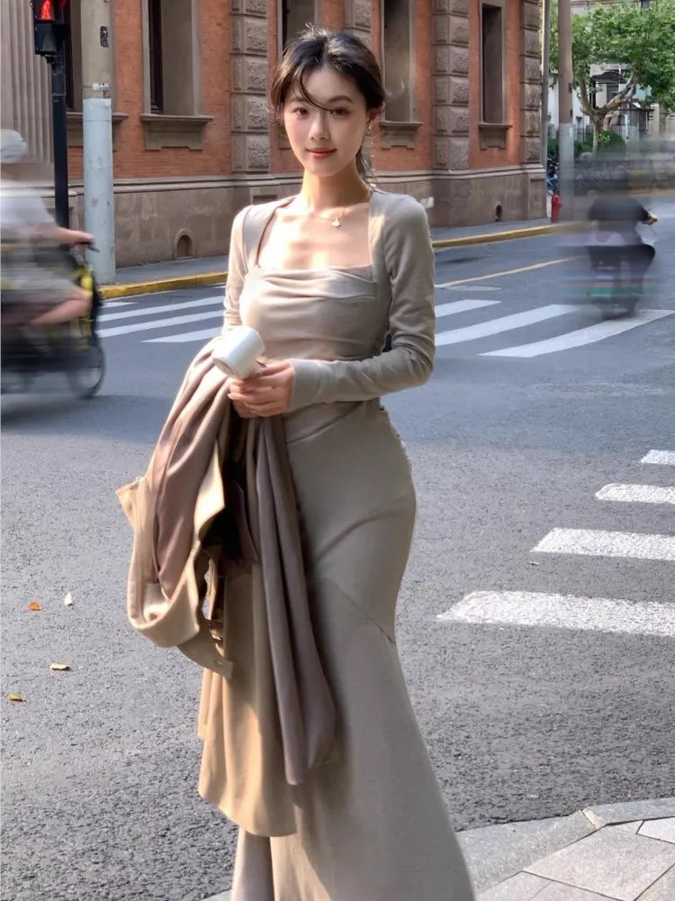 LIZAKOSHT - Elegant Square Collar Knitted Dress Women Autumn Winter Long Sleeve Slim Waist Mermaid Vestidos Korean Fashion One Piece Dresses