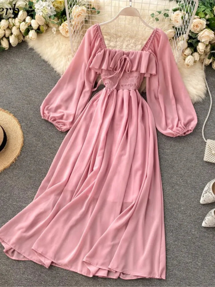 Lizakosht Elegant Square Collar Maxi Dress Women Solid Chiffon Puff Long Sleeve Elasticized Waist Korean Fashion Vintage Ruffle Vestidos